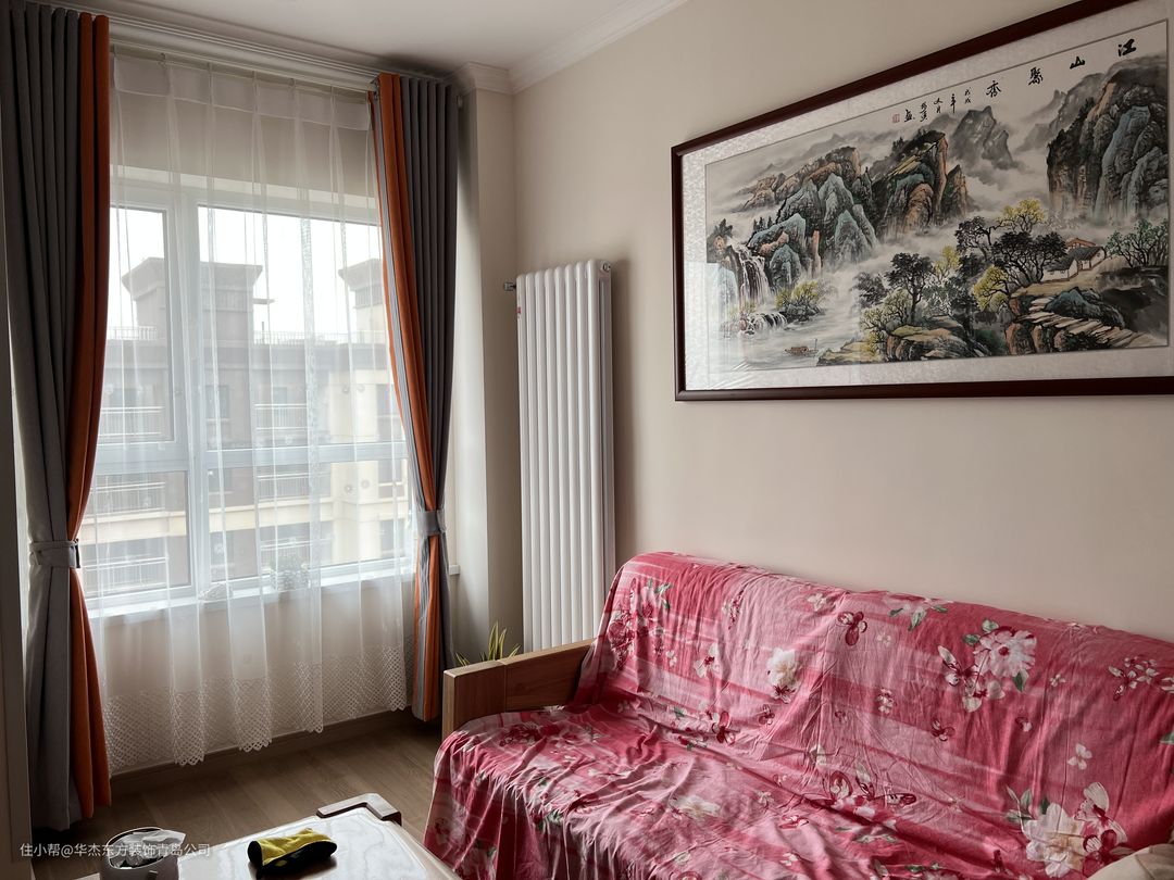 沙发背景墙挂了一幅风景装饰画,暖气片旁边再加上一个小绿植,简约而又高级。