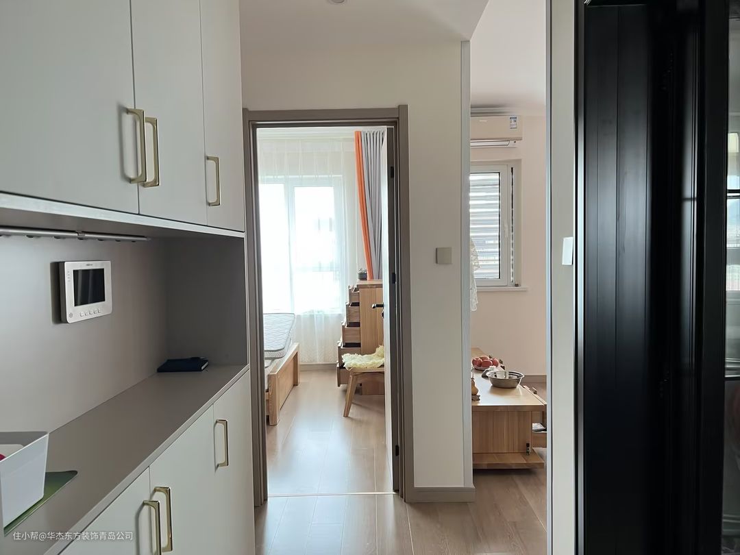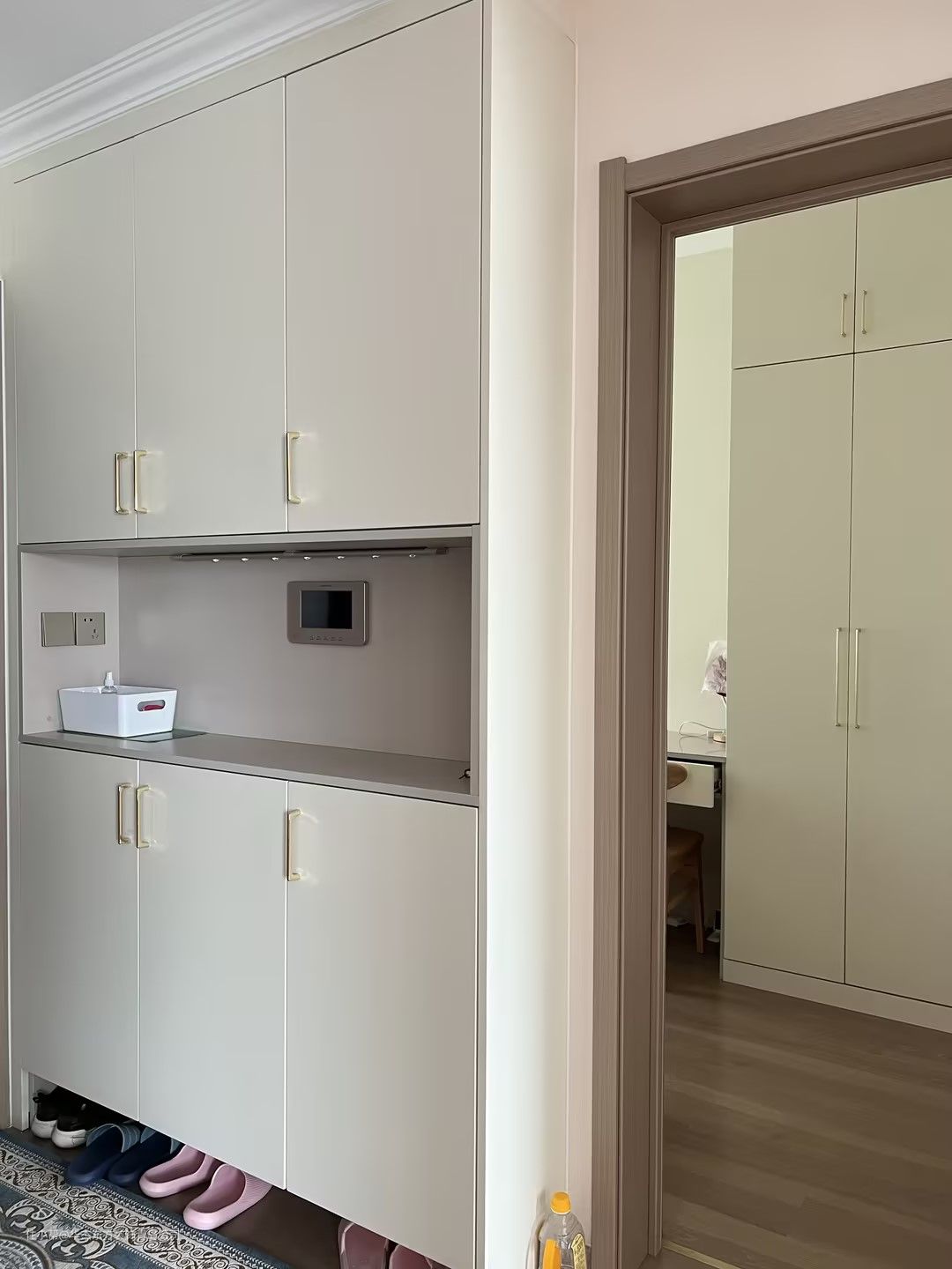玄关左侧是一个收纳柜,浅灰色柜体搭配白色柜门,线条简洁,分区适当,避免扑面而来的拥挤感。