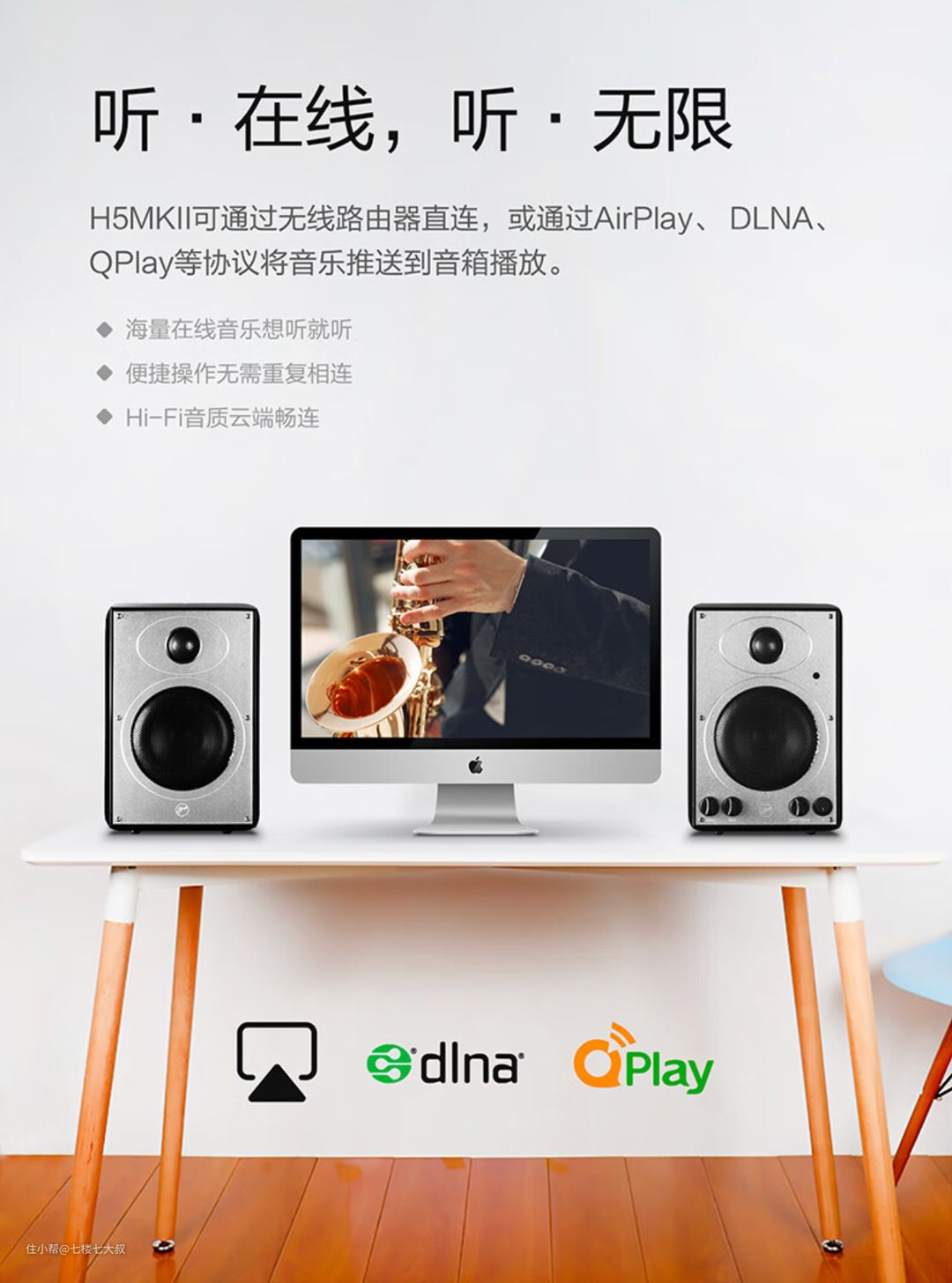 惠威D300采用惠威的等磁场高音和6.5英寸长冲程低音,支持桌面脚架2种模式,适合20-30㎡客厅使用。