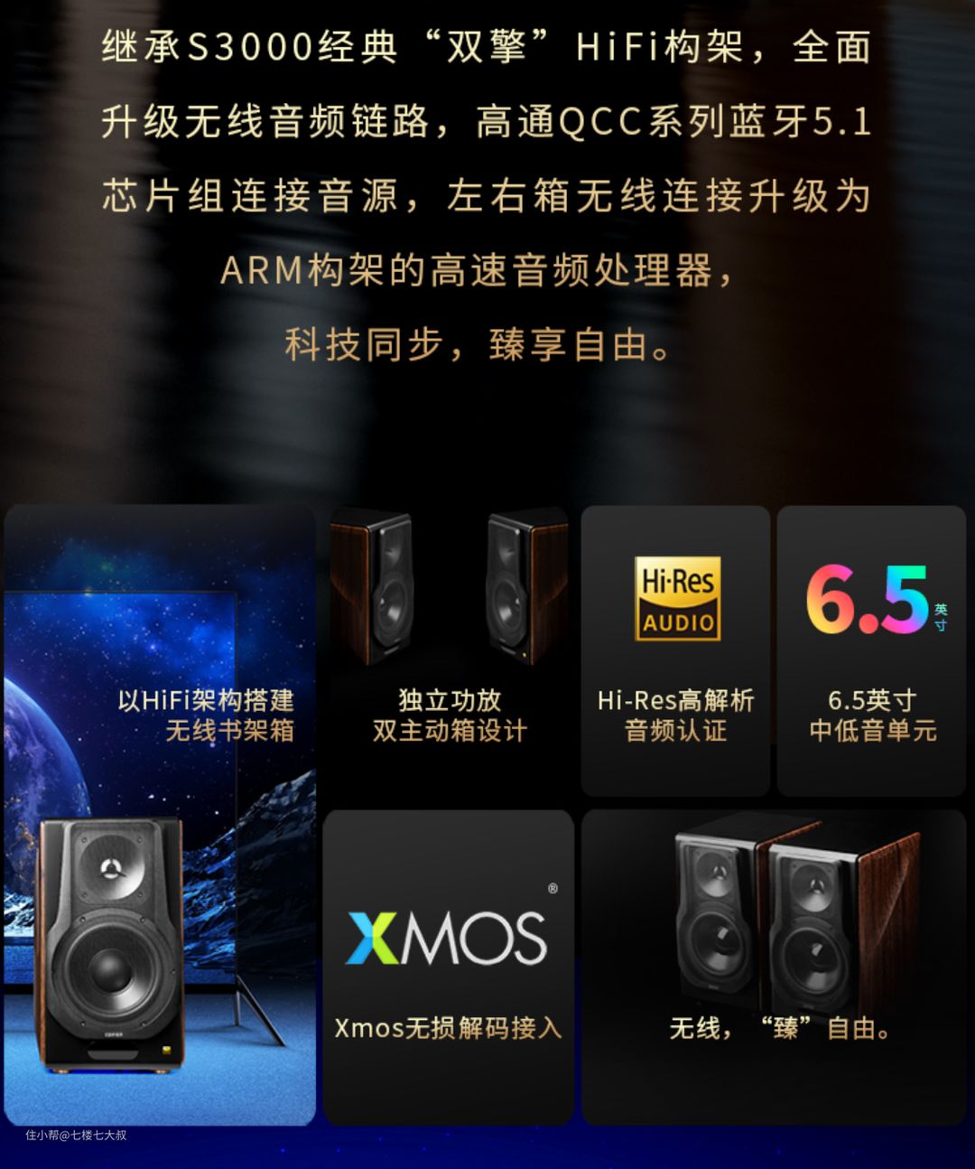 钛顶高音搭配6.5英寸的中低音单元,频率响应:38HZ-20KHZ,额定功率128W+128W
