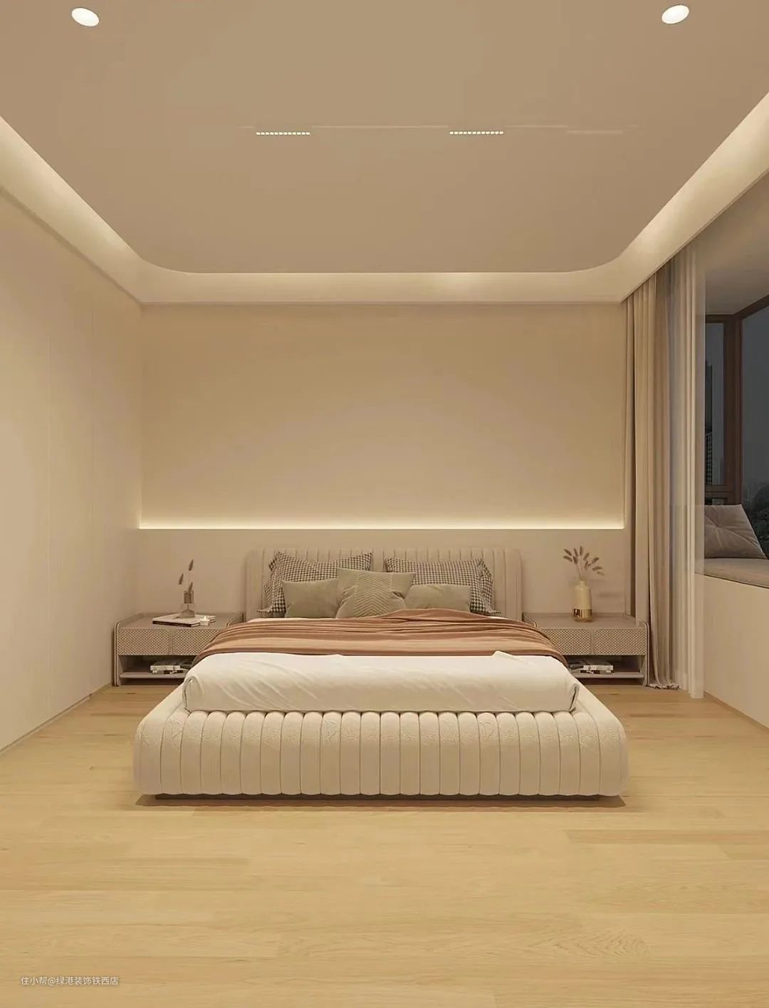 以耐看、高级为主,在吊顶上添加一圈线性灯,既简单又赋予空间的美感,在这样的房间,一天的情绪和疲惫也得到了舒缓。