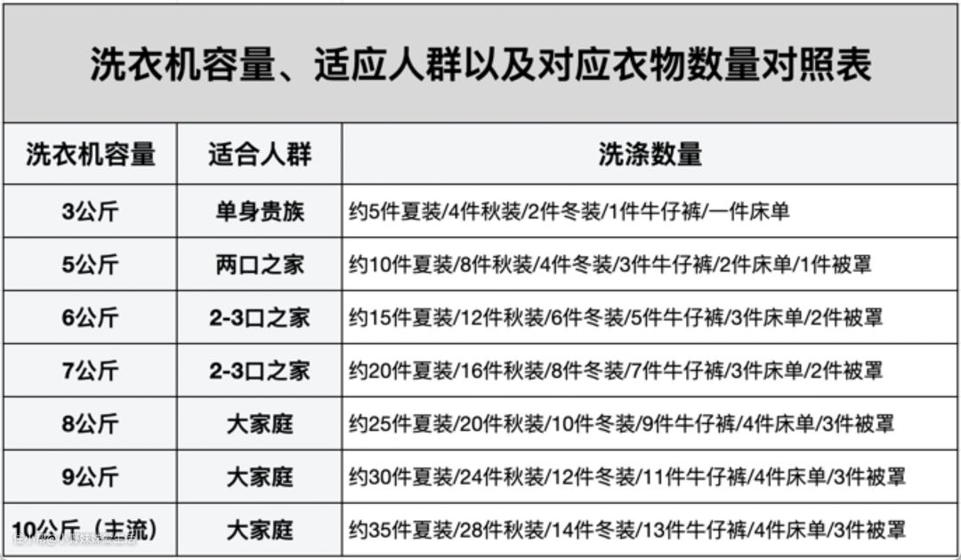 建议:8公斤起步,10公斤最好。(10公斤也是市面上的主流洗衣机容量)