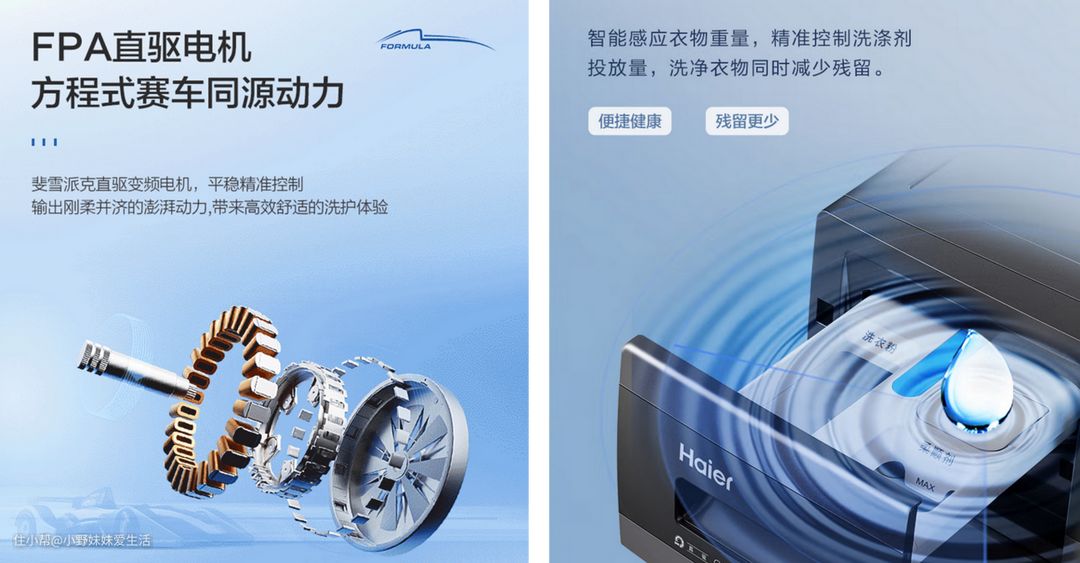 - 电机方面:海尔纤美176是FPA直驱电机,而西门子这款是BLDC电机;