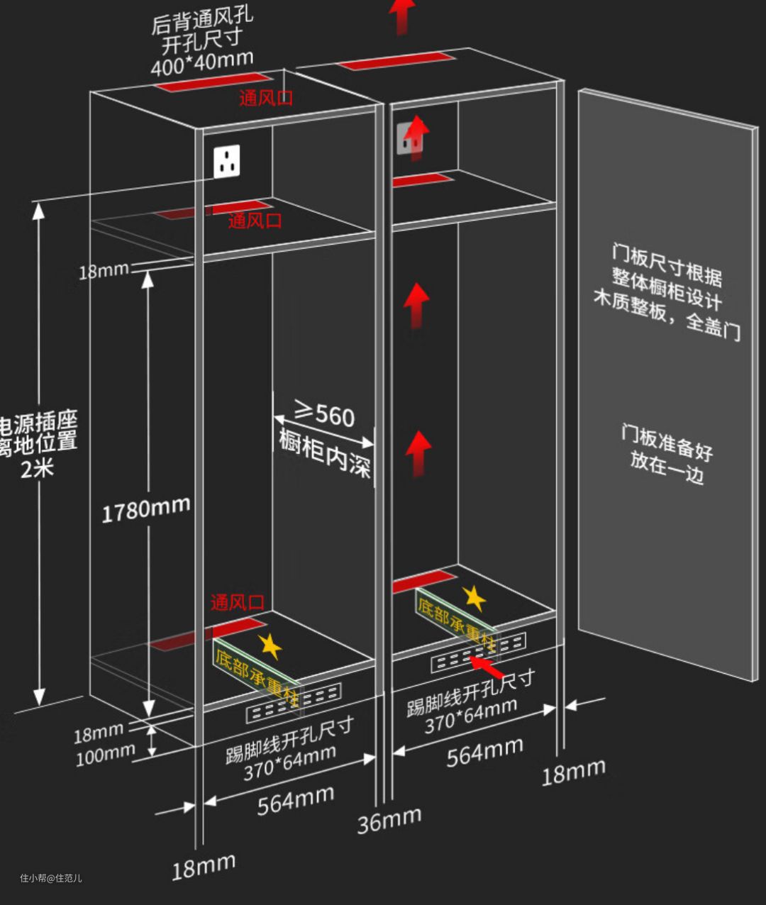 先要确定家电的散热孔在哪,全嵌入式冰箱的散热孔一般在底部留进风口,散热孔留在柜子顶部或直接连接吊顶。