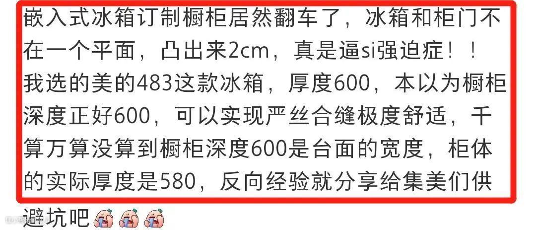不想冰箱超出柜子表面可能要做更厚的柜子,这显然要加钱,预算里得考虑到。