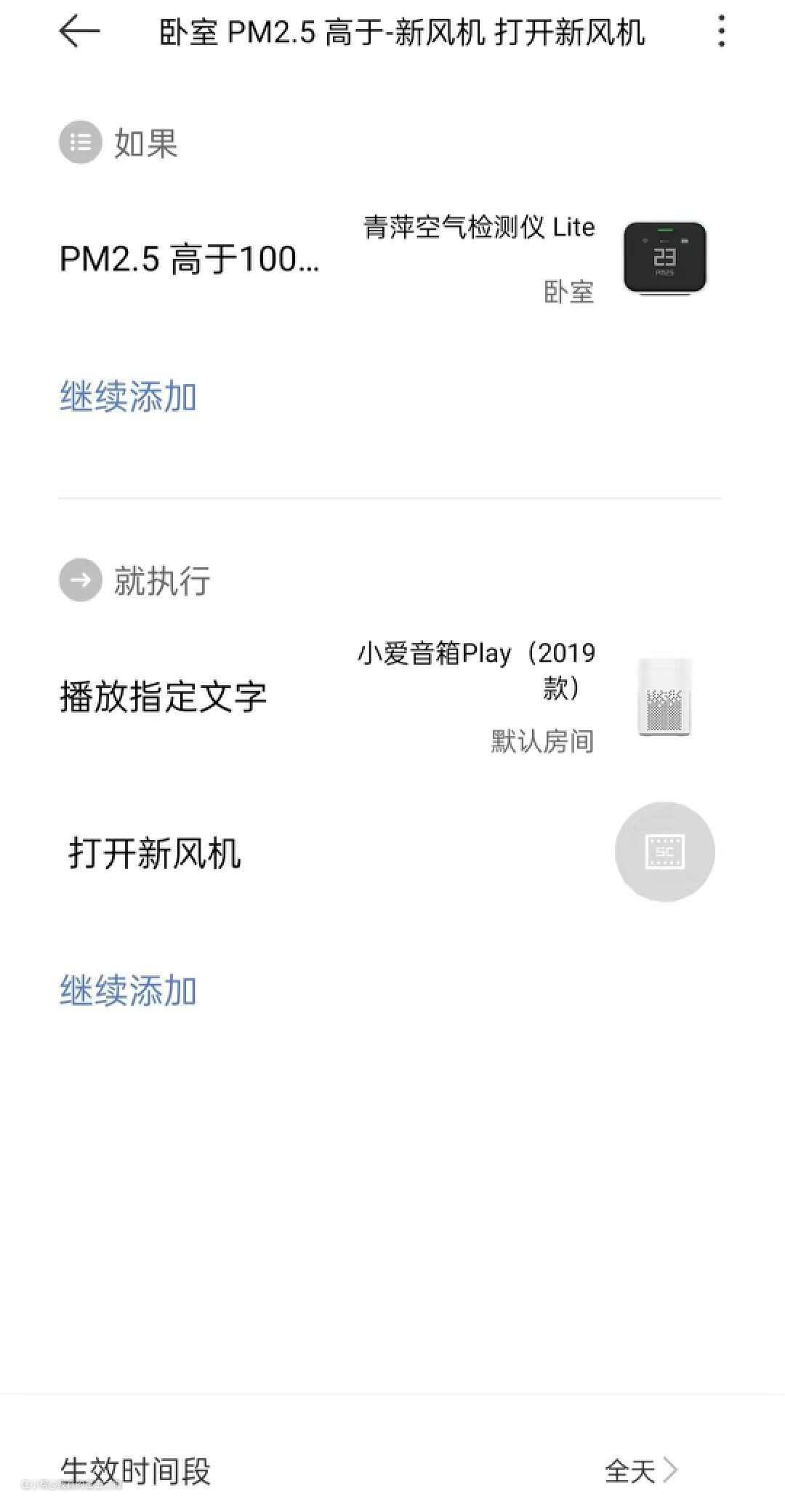 参与设备:新风机、空气净化器、加湿器、门窗传感器(非必须)、空气检测仪、温湿度传感器、人体传感器(非必须)、小爱同学(非必须,可用作关窗操作提醒)