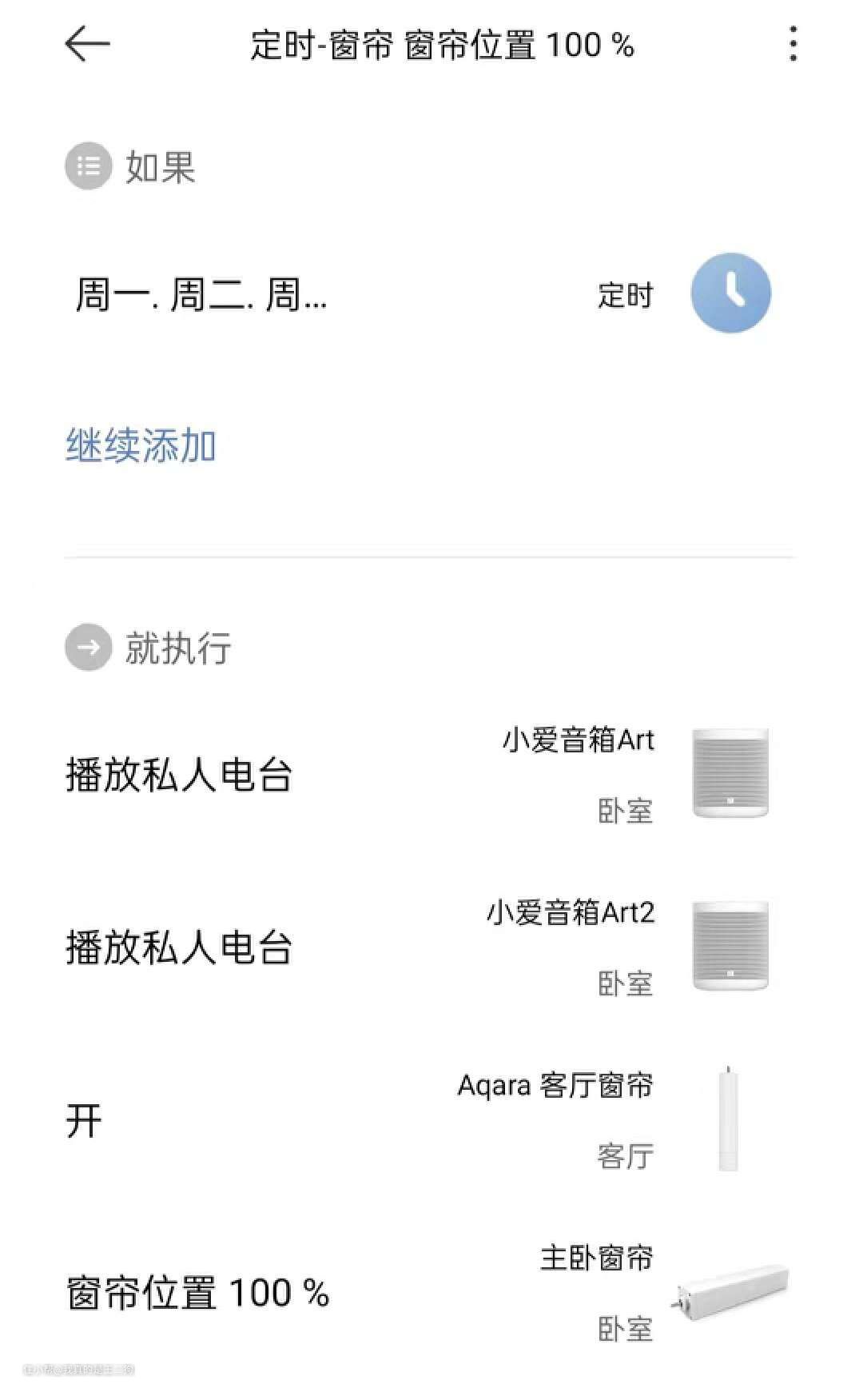 扩展与补充: 目前的智能窗帘开合度都可以自定义设定,大家可以根据自己需求选择。喜欢定时操作的小伙伴直接设定时间即可,也可配合光照传感器来通过亮度控制,甚至可以通过智能门锁的开关状态来匹配智能窗帘的开合。