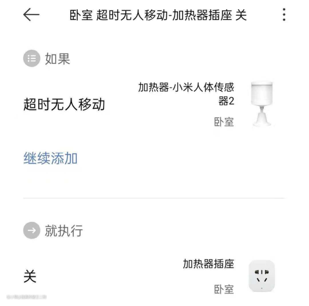 联动思路:通过将取暖器连接智能插座,让智能插座接入米家系统,配合人体传感器检测办公桌前的动态判定人员是否长时间离开,满足设定时间要求自动关闭取暖器电源。