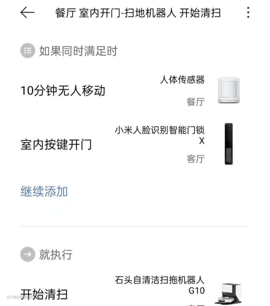 联动思路:触发条件为智能门锁的门锁上提动作,系统检测到人员离家后自动进行清扫工作。