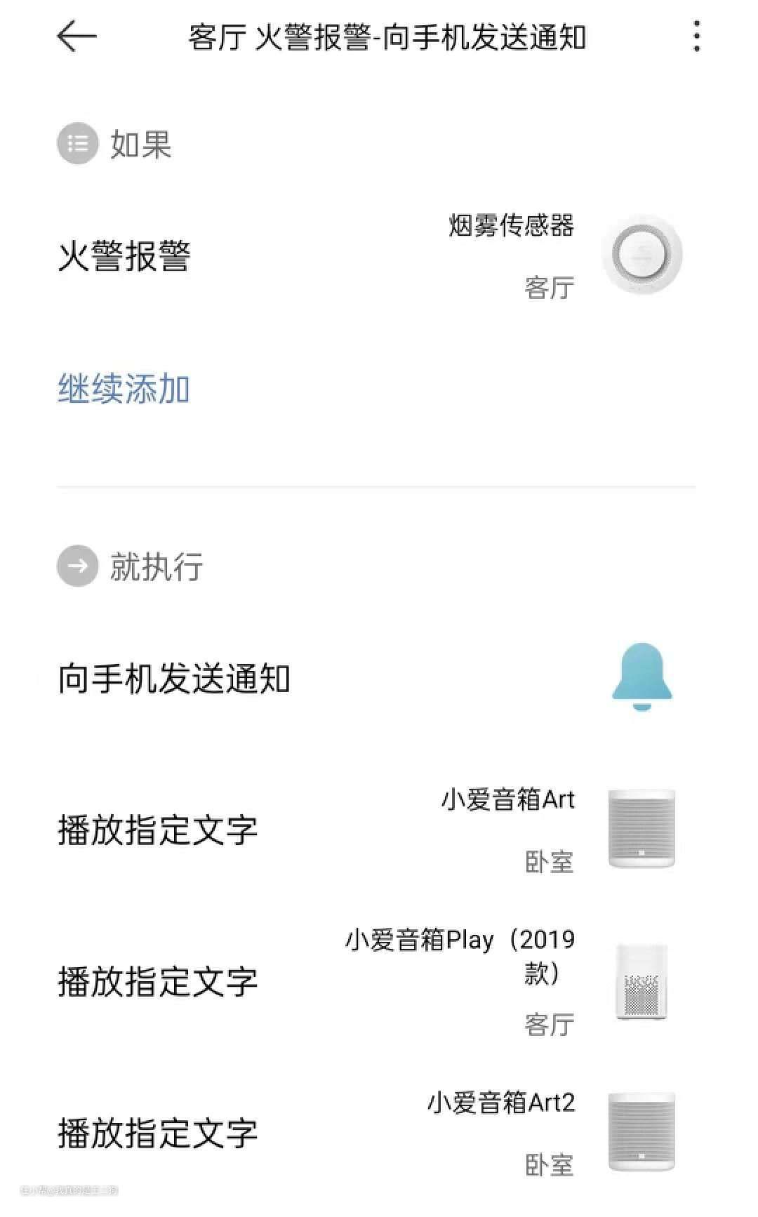 联动思路:天然气报警器/烟雾传感器检测到家中相应问题后,联动抽油烟机、风扇进行抽排操作,同时配合手机推送提醒相应问题,小爱音箱可以设定相应语音警示。