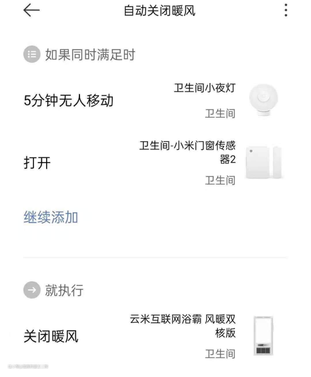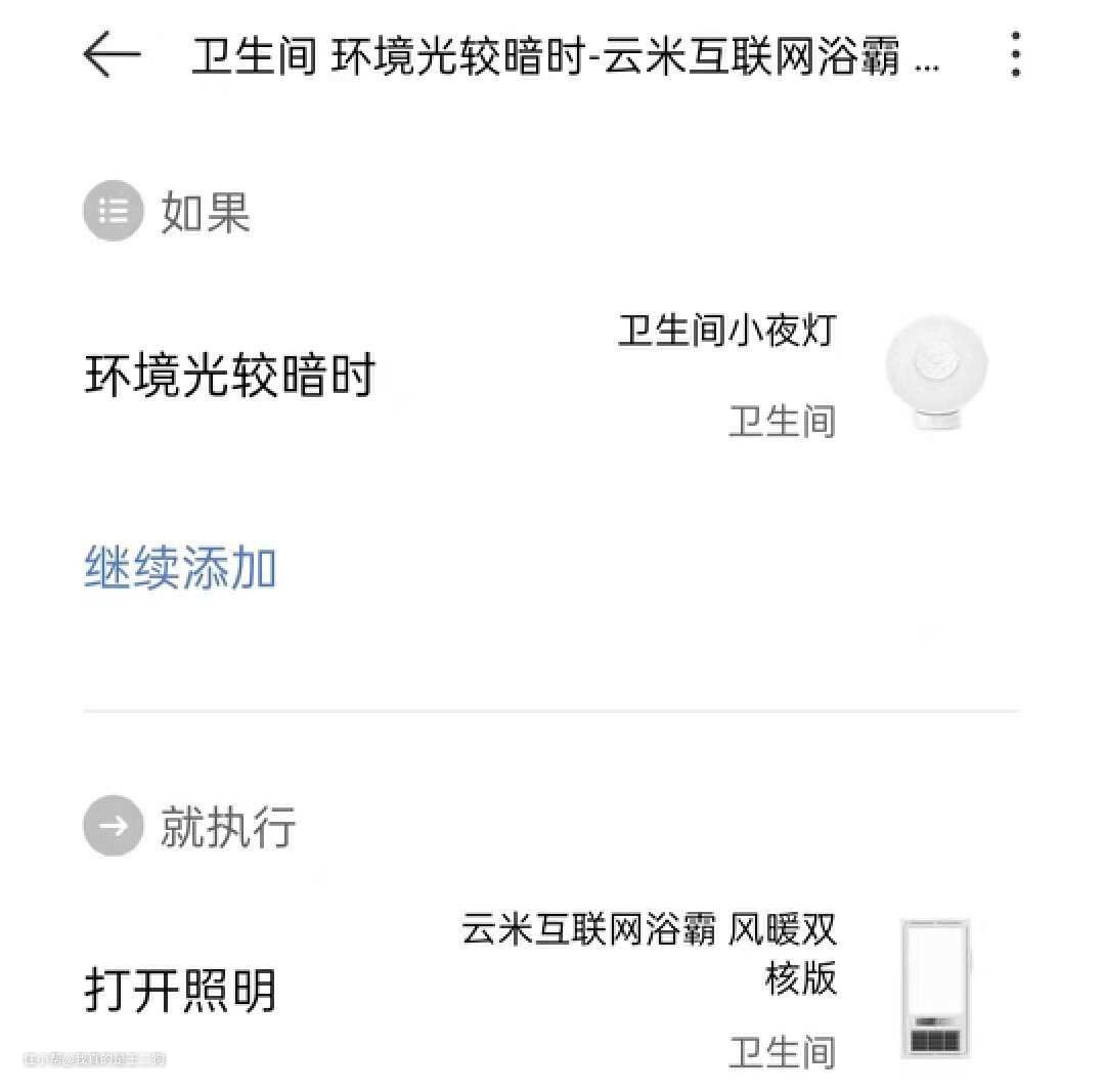 扩展与补充:这算得上是一个补充方案,日常还是习惯自己进行开关操作,这个可以作为忘记关闭浴霸的补充操作。传感器的组合可以根据自己情况考虑,一般一组门窗传感器+一组人体传感器即可。