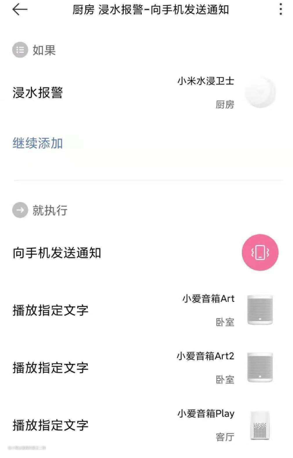 联动思路:浸水传感器检测到厨房漏水,可以实时发送提醒信息到手机,同时通过小爱音箱和多功能网关等语音输出设备进行报警。