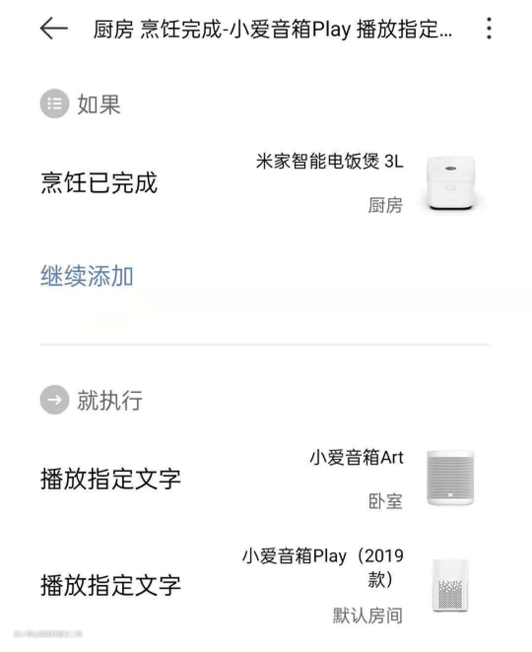 扩展与补充:日常来说,烹饪类家电完成操作进行提醒。或者洗衣机、洗碗机这种需要较长工作时间,完成后联动提醒会比较方便。其他有类似需求的家电也可以进行相应配置。
