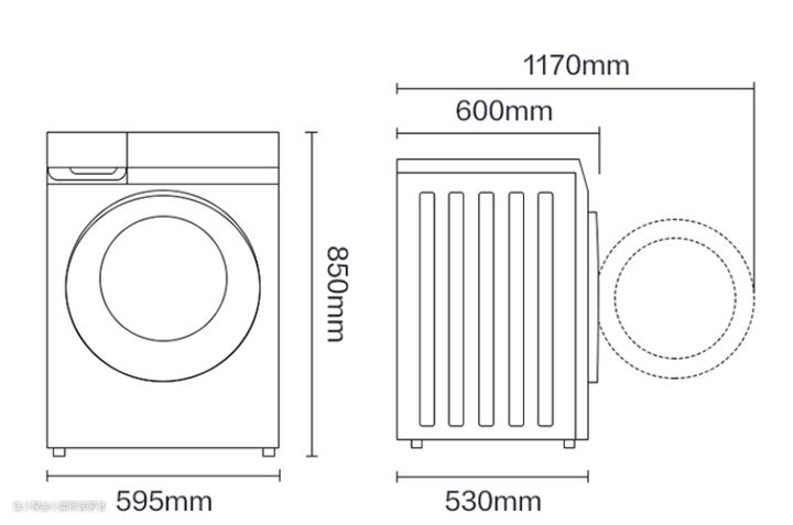 主流10公斤款的滚筒,标准尺寸为:600mm*595mm*850mm(深*宽*高),如下图: