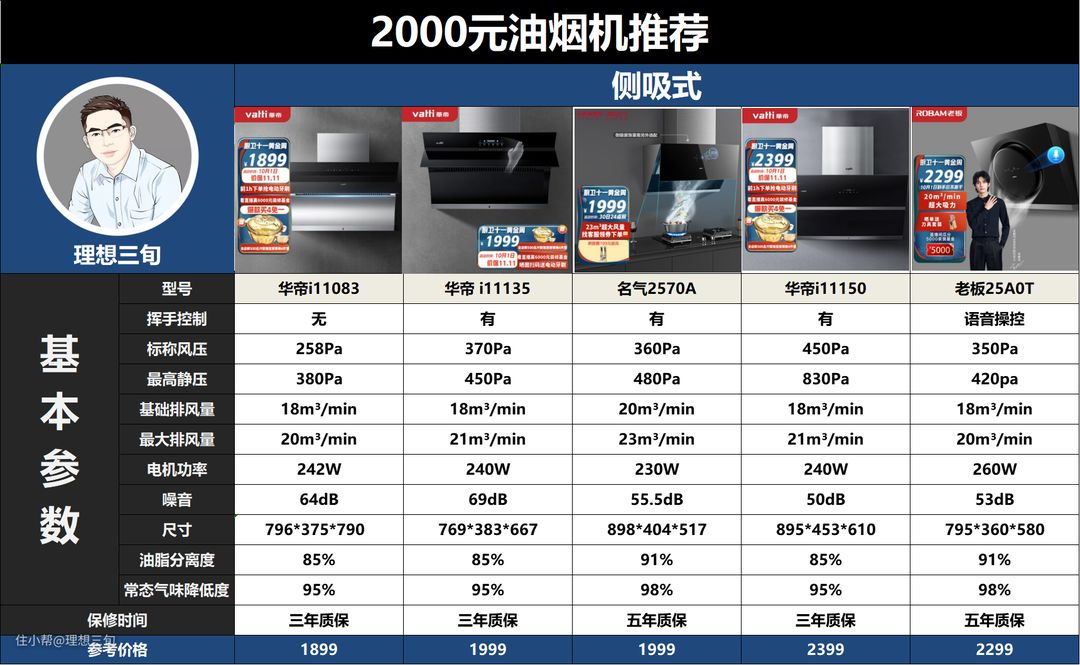 这个价位,侧吸唯一的选择就是华帝i11193+72B,无他,23m³/min排风量+1000pa静压+5.0Kw其他的都没法跟他打,这个直接买!,
