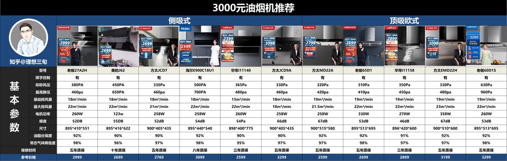 - 2900-3300价格区间:华帝i11158、方太EMD22H、老板60D1S。