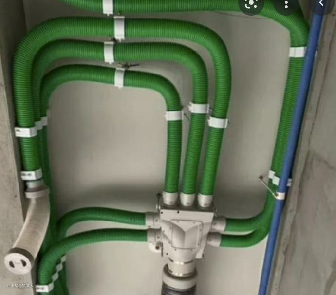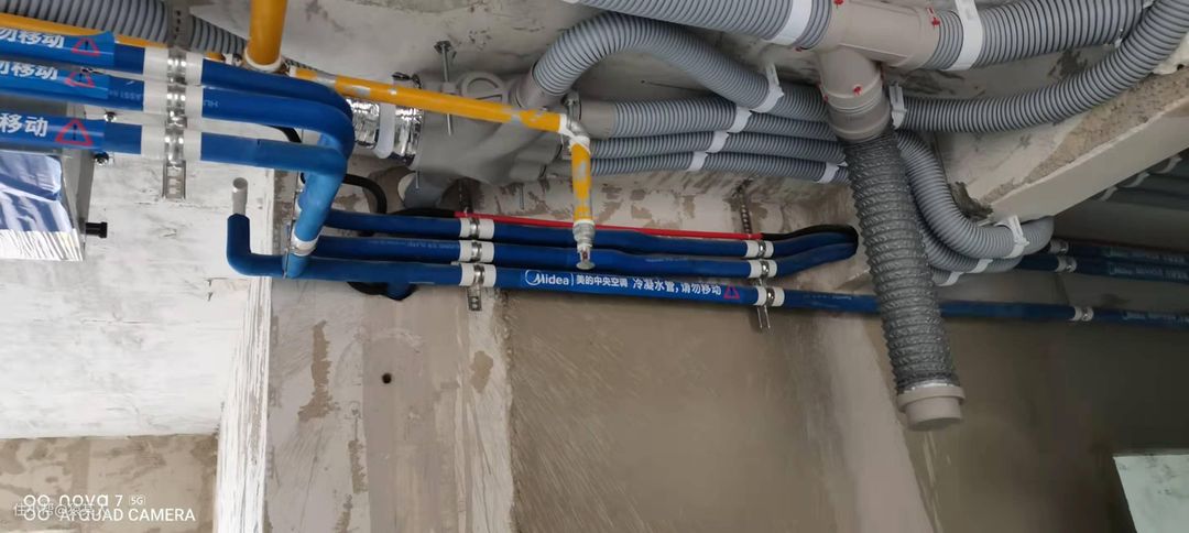 图中蓝色为中央空调管路,灰色为中央新风管路,黄色为消防水管。图源:暖通产业网