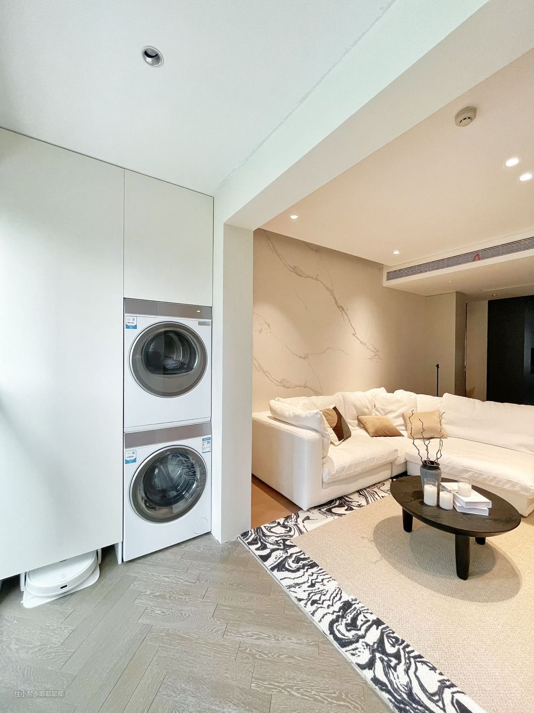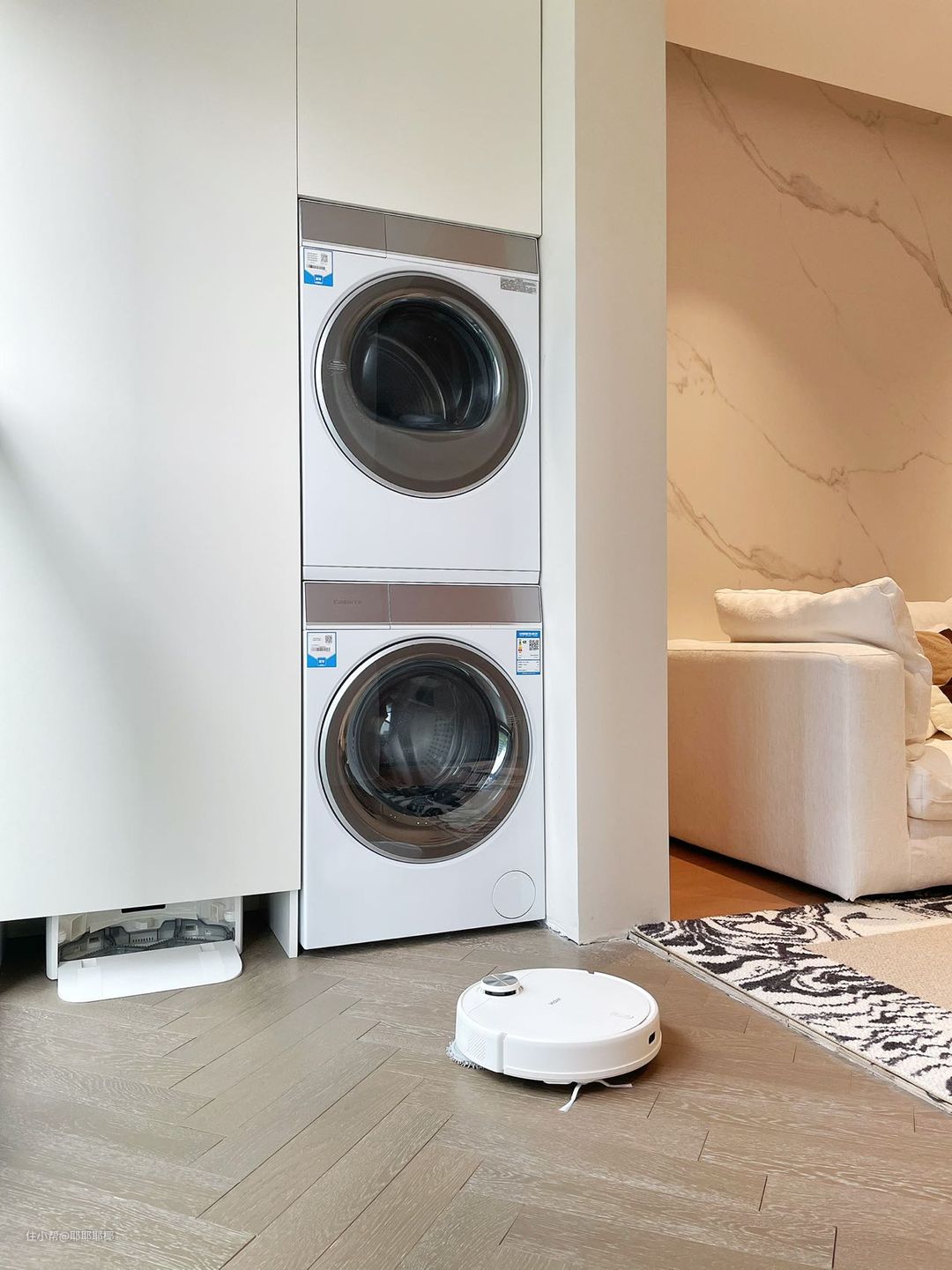 传统阳台都是以晾晒功能为主,但这样的阳台既占空间又不美观。所以改造的思路就是放弃了传统阳台的洗手台+晾衣架的设计,衣服用烘干机来烘干。找全屋定制给阳台的两侧都做了储物柜,增加储物空间。洗衣区的柜子,左侧下方给扫地机器人留了出口,右侧做了洗烘套装的嵌入式预留位。每天下班回家就够累了,地面清洁交给扫地机,洗衣烘衣交给洗烘套装,根本没有我俩啥事儿~