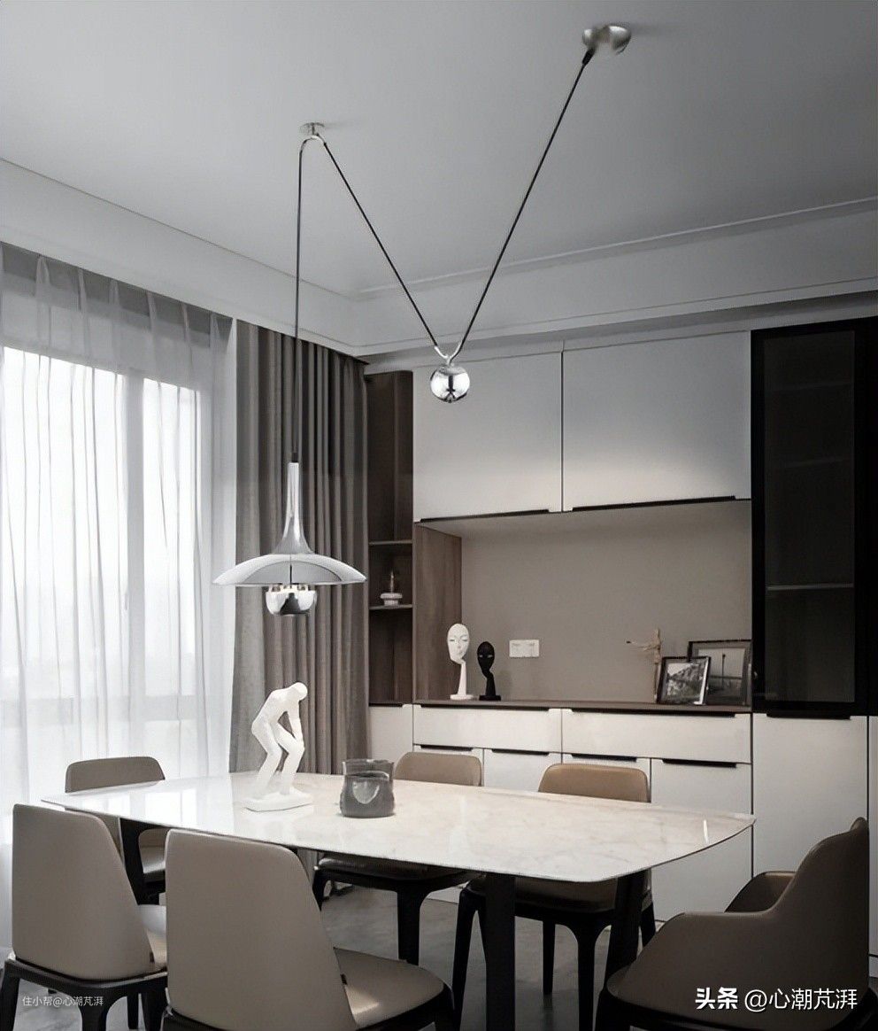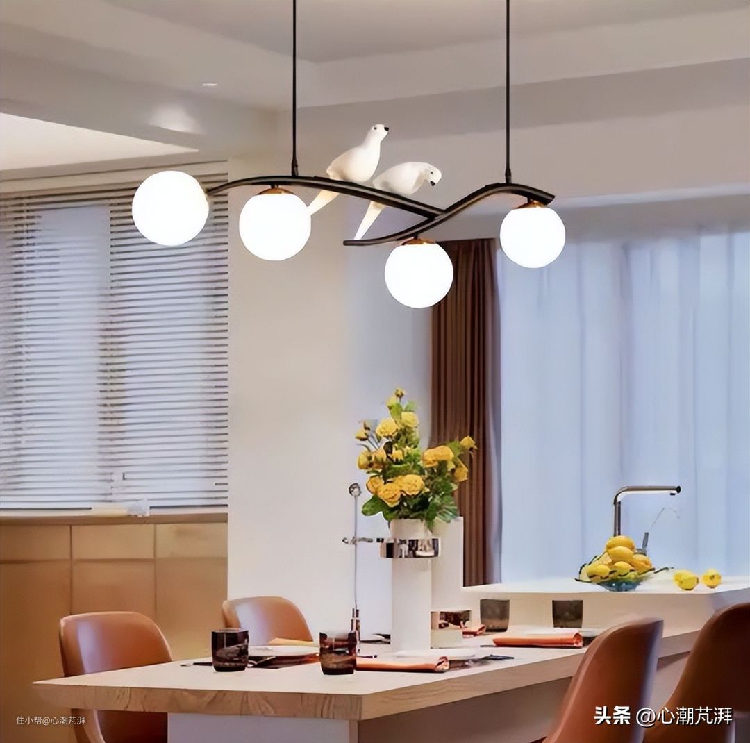 ▲最长使用的是大面积客厅及餐厅区域,选择合适的吊灯能营造相当好的氛围。造型复杂或较大高度的吊灯建议面积大、层高教高的客厅选用,不然容易起到适得其反的效果,空间内会比较压抑。而餐厅区域如选择吊灯也适宜用简洁大气的暖光灯,毕竟吃个饭也不用把饭菜照的颗粒分明,还是以调节氛围为主。另外,吊灯虽然造型别致好看,但容易积灰,打理起来确实费力,还需酌情考虑。