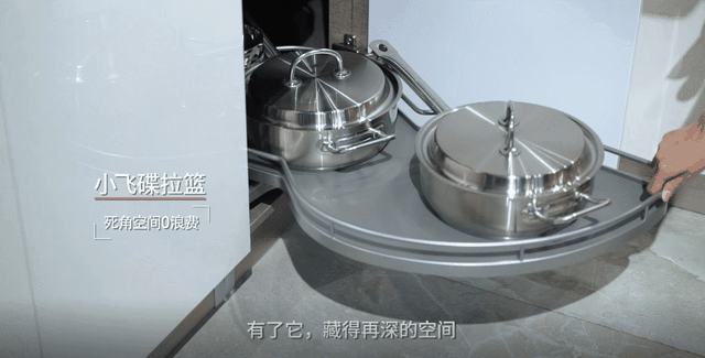 厨房能收纳的地儿除了吊柜、台面、地柜外,各种犄角旮旯的零碎地方都可以利用起来!就像厨房拐角处,只要做成旋转拉篮设计,再深的空间也能轻松利用,大盆或者锅放在里面,收纳能力杠杠的。