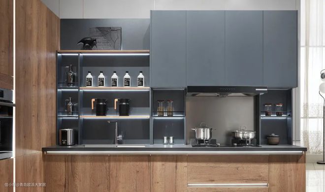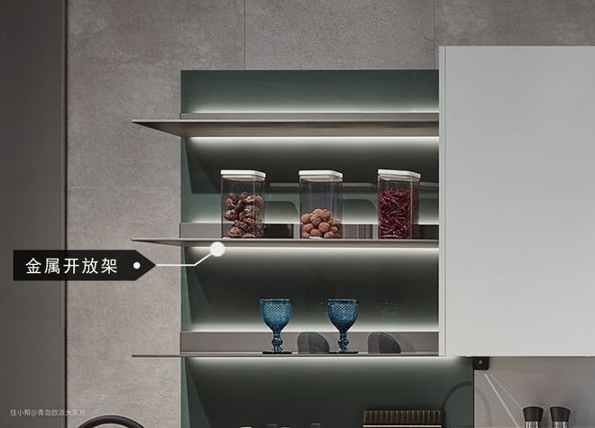 橱柜内部的收纳空间很大,可以额外添加几层开放架做好多层收纳整理,物品摆放更加有序,美观又实用。同时还能打破封闭柜体的沉闷感,增加空间层次感。