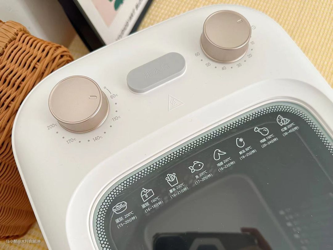 除了好清洗外,这款空气炸锅使用时也是超级简单的。它是旋钮式控制的,左面旋钮用来控温,温控范围60-200℃;右面按钮用来定时,时间范围1-60min ,使用时只要扭一扭可以了,家里老人也能轻松上手。而且天窗上贴有菜单小贴士,我们常做的食谱需要的烘烤温度和时间和都明明白白的写在上面,超级贴心~ 可以说,这款空气炸锅从开始到结束,每个环节都妥妥帖帖照顾到了,就是一个好用!