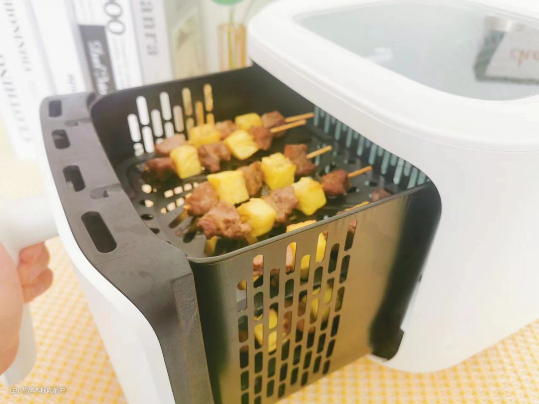 因为我用的这款空气炸锅能温度湿度双控制,所以能很好地控制炉内的湿度,烤出来的牛肉不会干柴发硬,口感是鲜嫩多汁的。我烤了两层牛肉菠萝串,一次吃满足~