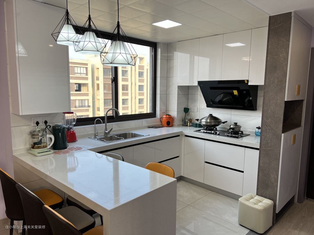 本案例入户即为玄关和开放式厨房。开放式厨房搭配窗户的设计,整体采光明亮,设置U型布局和宽为60cm的台面,合理安排动线,下厨更顺手,开放式厨房,所以也选用了吸力大的油烟机,多个插座分布,方便用一些厨房小家电。整体白色明亮简洁,也让入户空间显得宽敞。