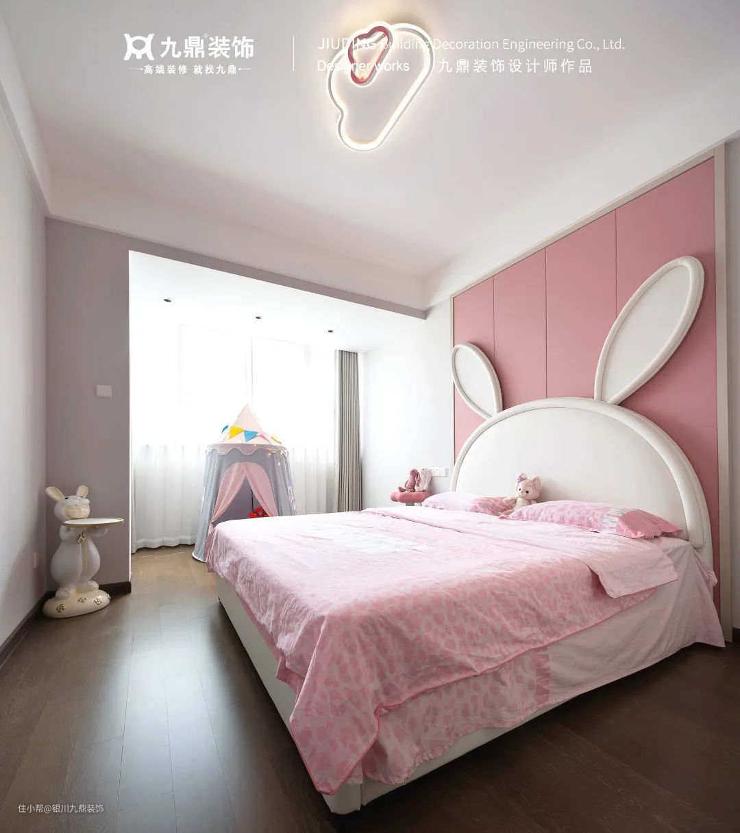 儿童房考虑到孩子的喜好,选用粉色调,局部点缀卡通元素;整墙定制衣柜,一年四季的衣服都放得下;靠窗做定制书桌,满足孩子成长需求。
