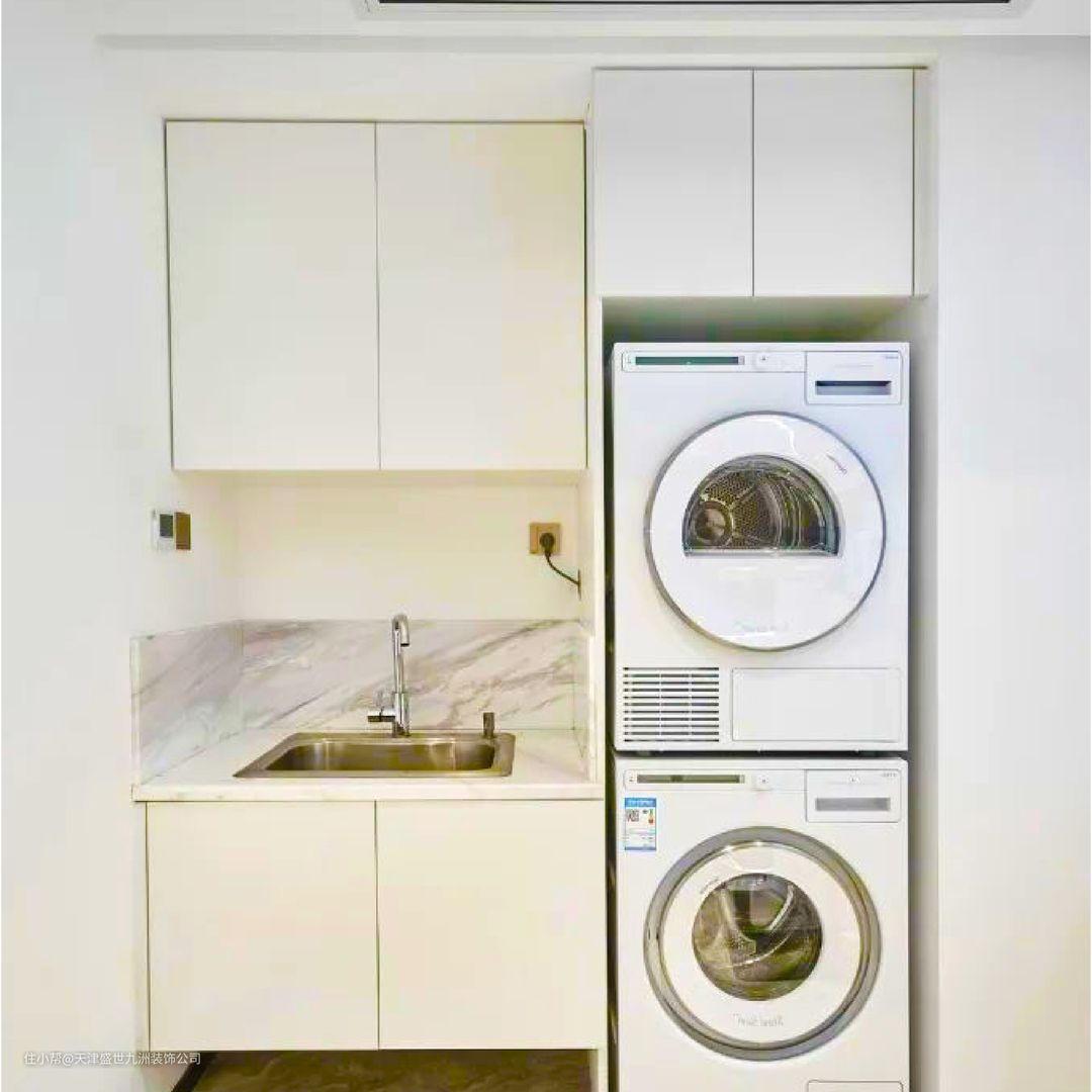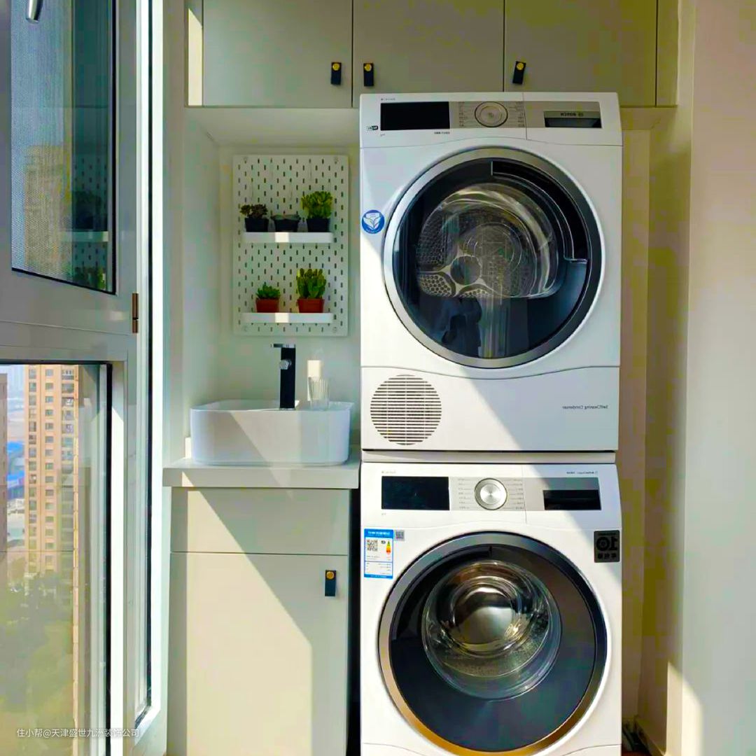 将洗衣柜+洗衣机的组合放置在具有家庭洗衣晾晒区的阳台,是非常符合动线设计的思路,柜子也可以放置洗衣用品等。