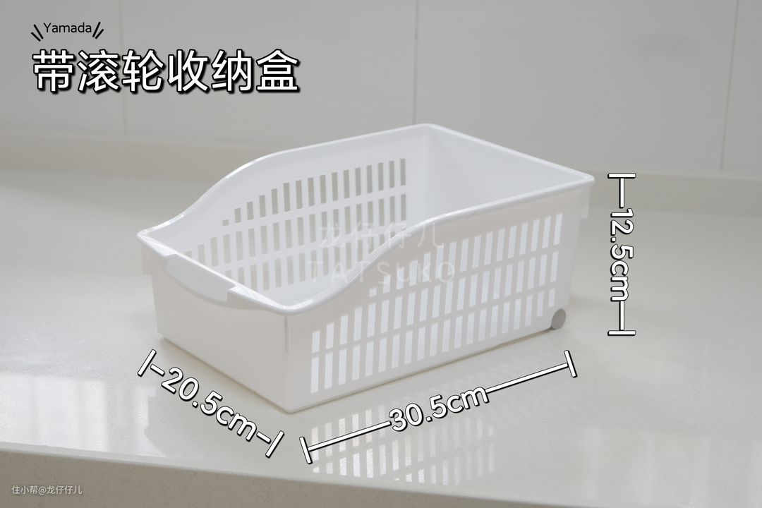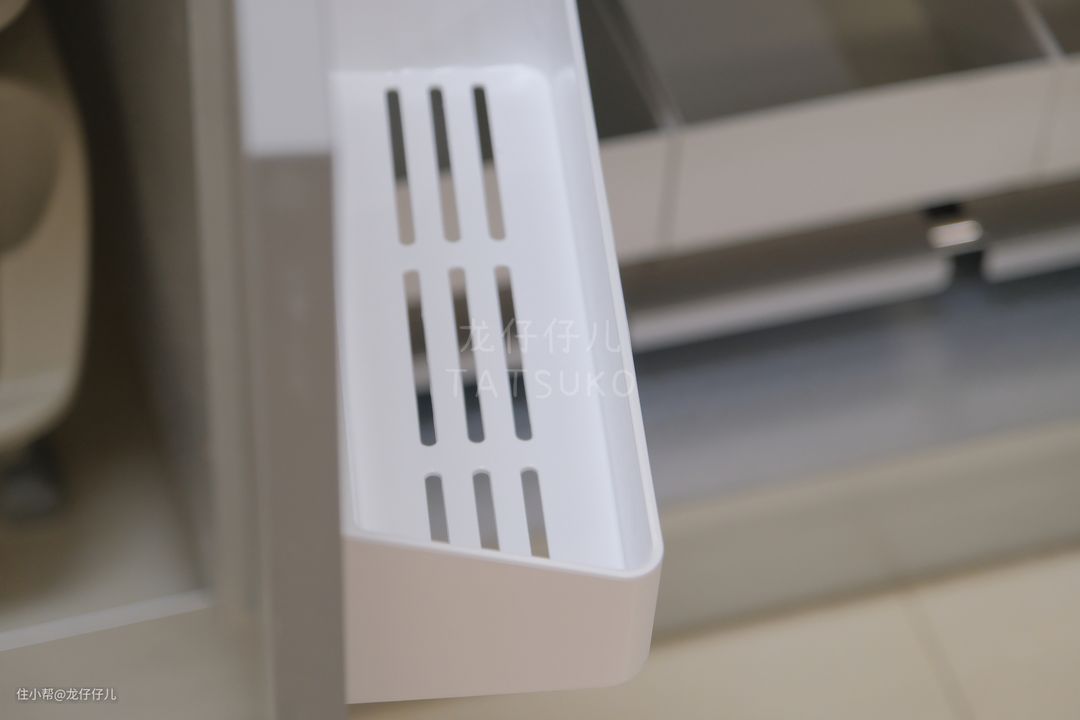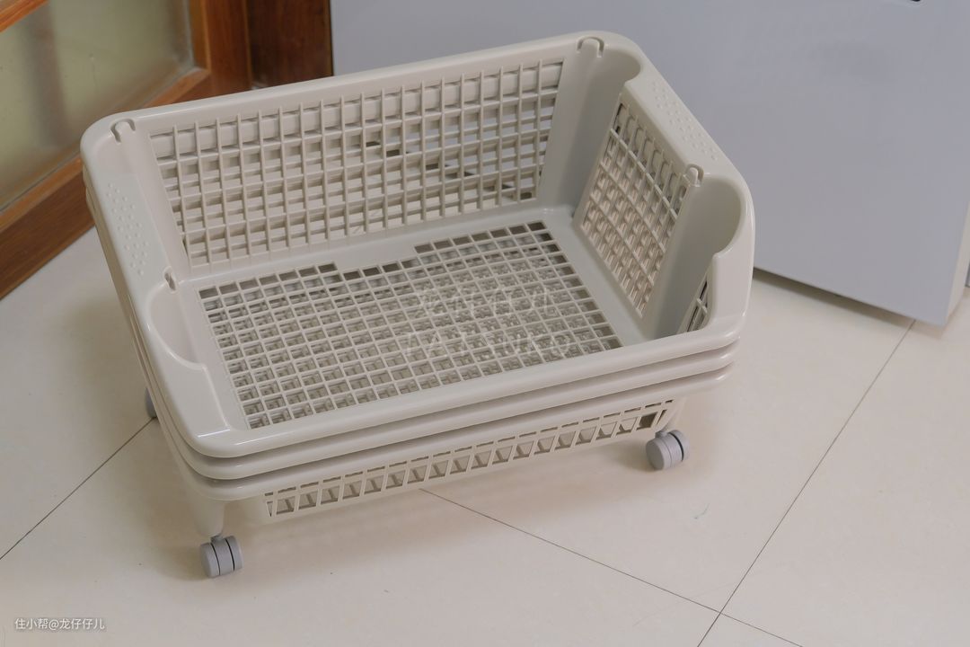 全方面镂空的塑料收纳篮既透气又好清洗。家里现在还没装洗碗机,就把它塞进了为洗碗机预留的空位里。其实它是带轮子的,很方便移动,而且可以随时拆卸或者叠放,很节省空间。