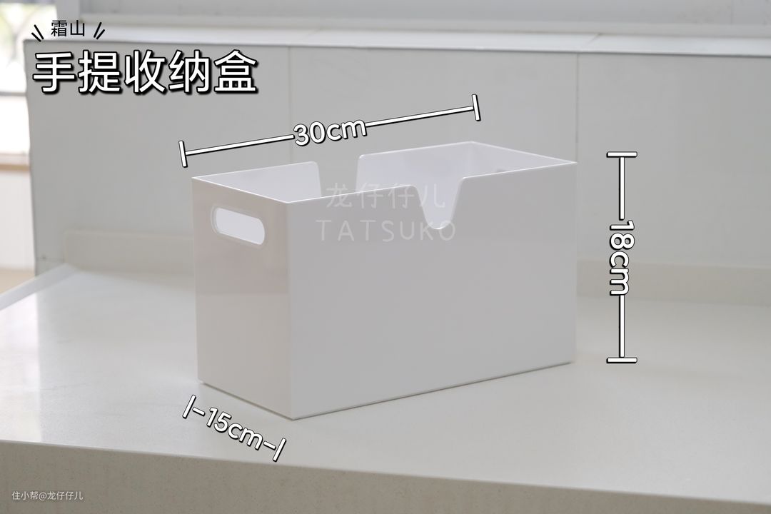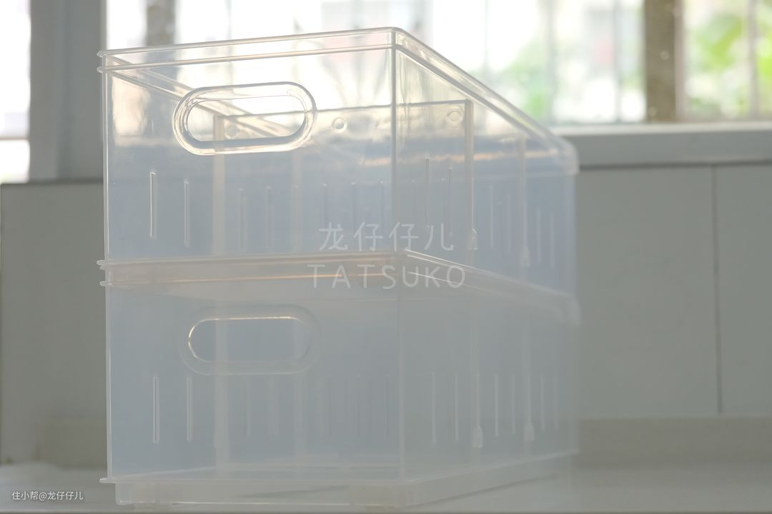 其实市面上还有很多吊柜专用的收纳盒,但是带把手的款式一般深度都超过了30cm,放不进我这个吊柜。而这款收纳盒有高低两种把手,在吊柜使用就把低把手这一面朝外,妈妈站在地上不用垫脚也可以拿到第二层的东西。