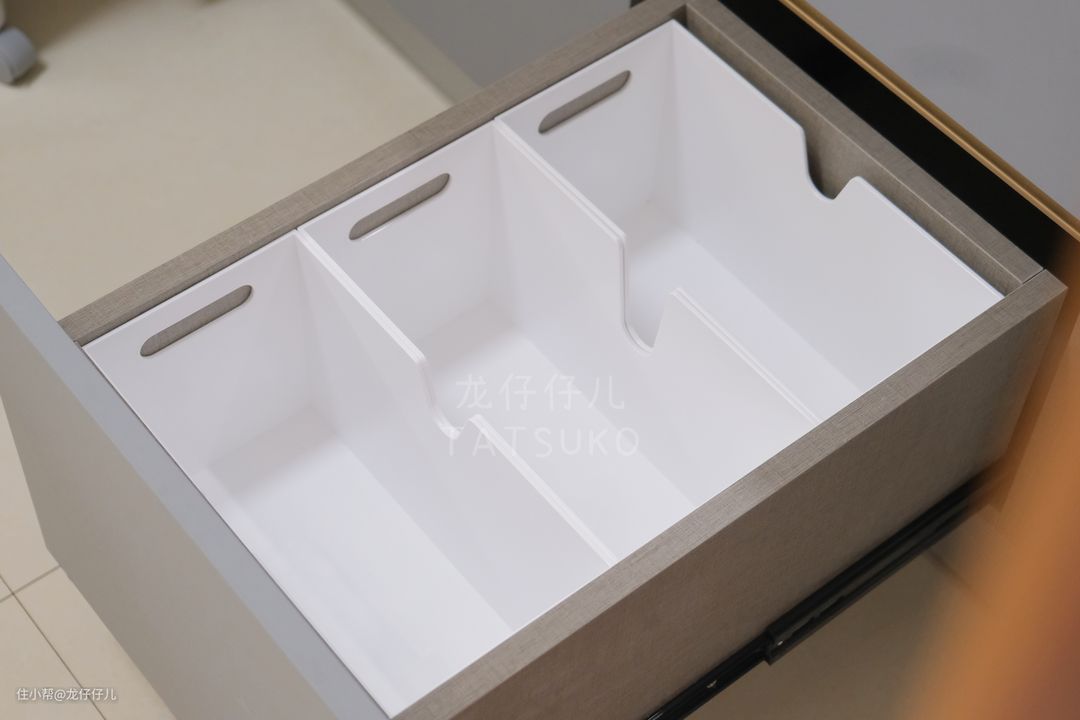 下层深抽内空宽30cm、深46cm、高18cm,和这套收纳盒简直是天作之合。安装橱柜时选用了可以完全拉出抽屉的三节轨,而直上直下的形状使得几个收纳盒彼此贴合,减少空间浪费,很适合放一些大瓶液体或大包装食材。