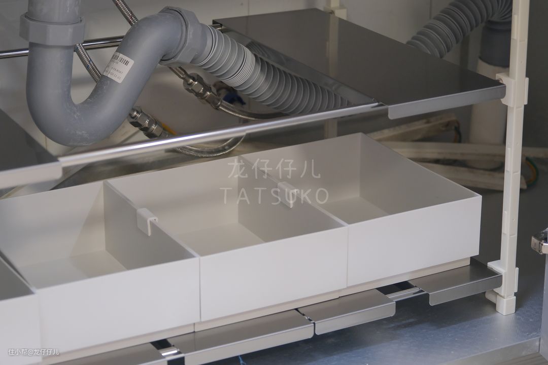 痛点:水槽柜底下管线复杂,可利用的空间不规则。以后如果加装垃圾处理器、洗碗机、净水器等,还需要随时调整收纳格局。