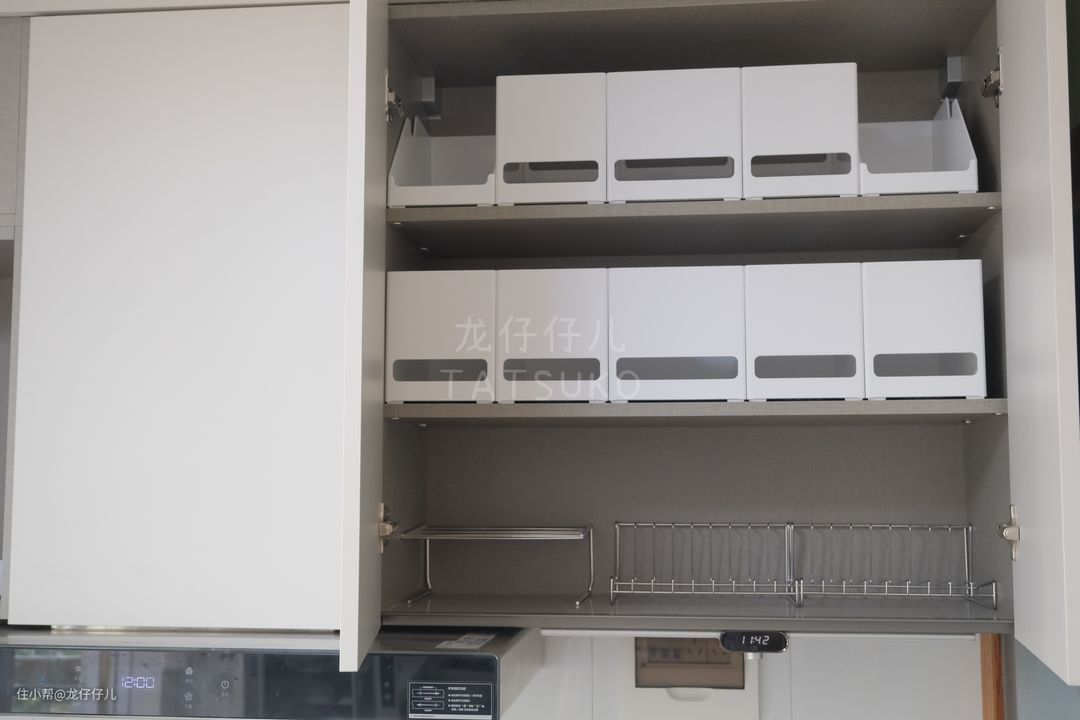 吊柜上两层用了直角收纳盒,这个系列的收纳盒有很多形状和尺寸可以组合搭配,我每层用了四个15cm宽、一个18cm宽的,组合起来是78cm,放在80cm宽的吊柜里也挺合适的。