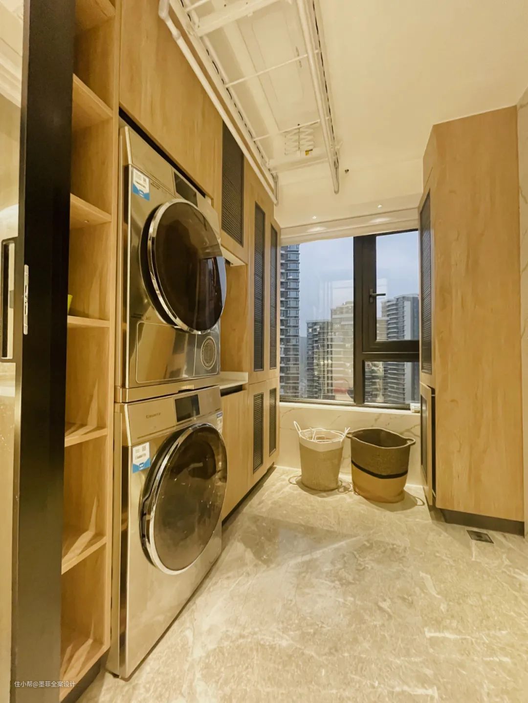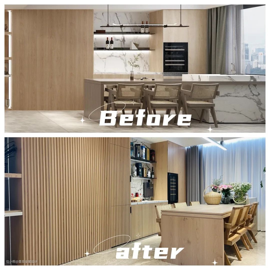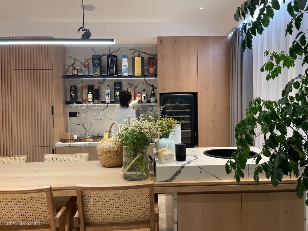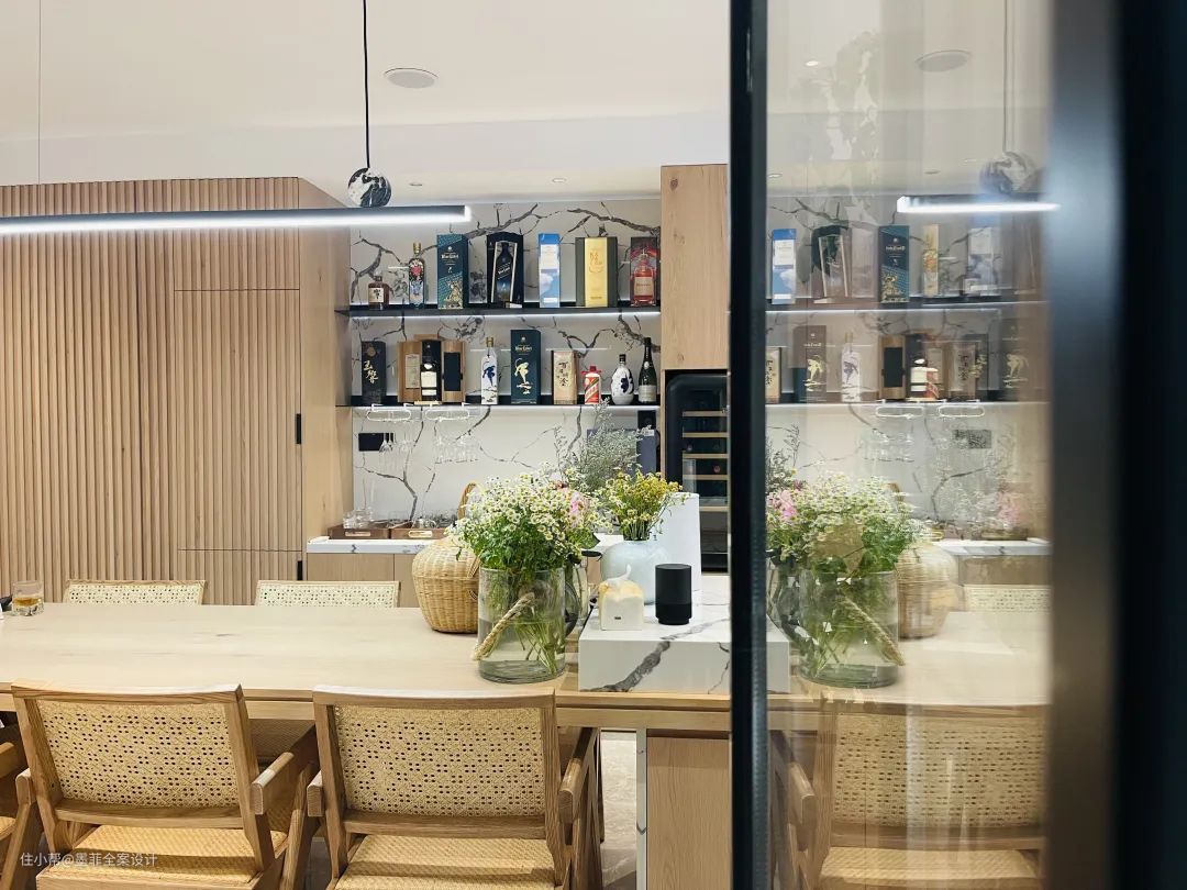 客厅和餐厅打通,扩大了整个视觉效果,让空间更有层次感和轻奢暖意,整整一面的原木风定制柜,收纳空间杠杠滴!不得不说原木风仙气飘飘,着实是小仙女必备。