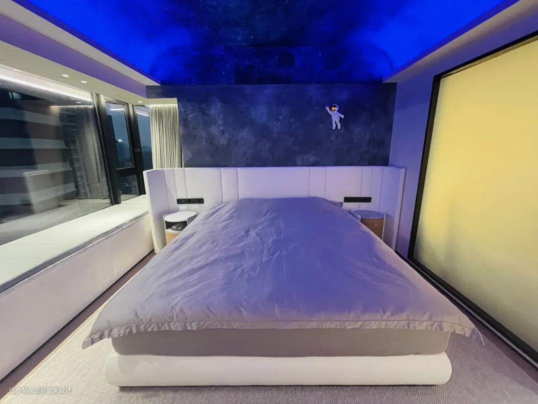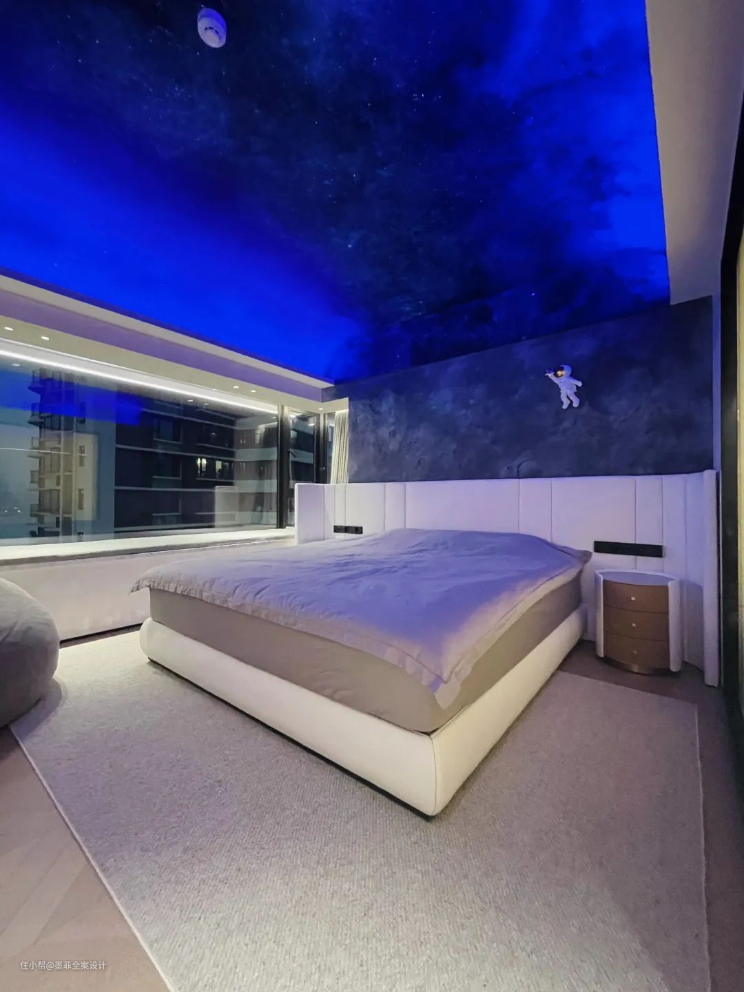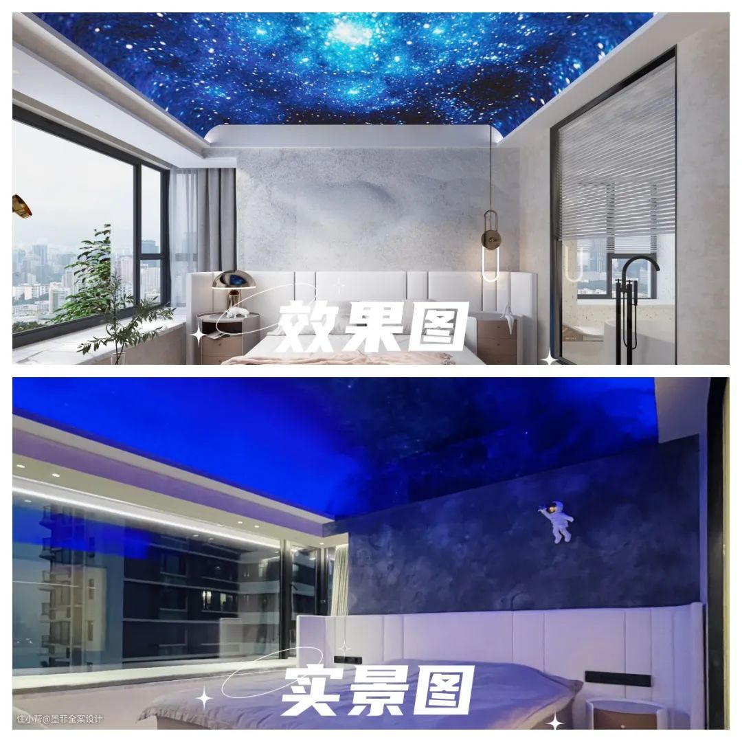 为了更好的落地效果,更贴合星空主题,在后期施工的时候设计师讲卧室背景墙作了修改,将原来的白色背景换成了深蓝太空主题;由于拍摄在晚上受光线影响,现场实际落地效果比照片震撼许多,满足了小姐姐对浪漫星空的一切想象。