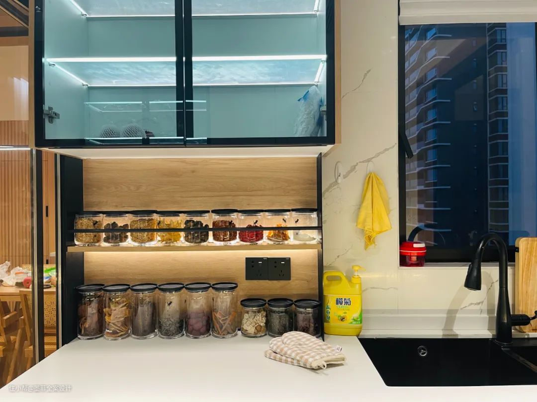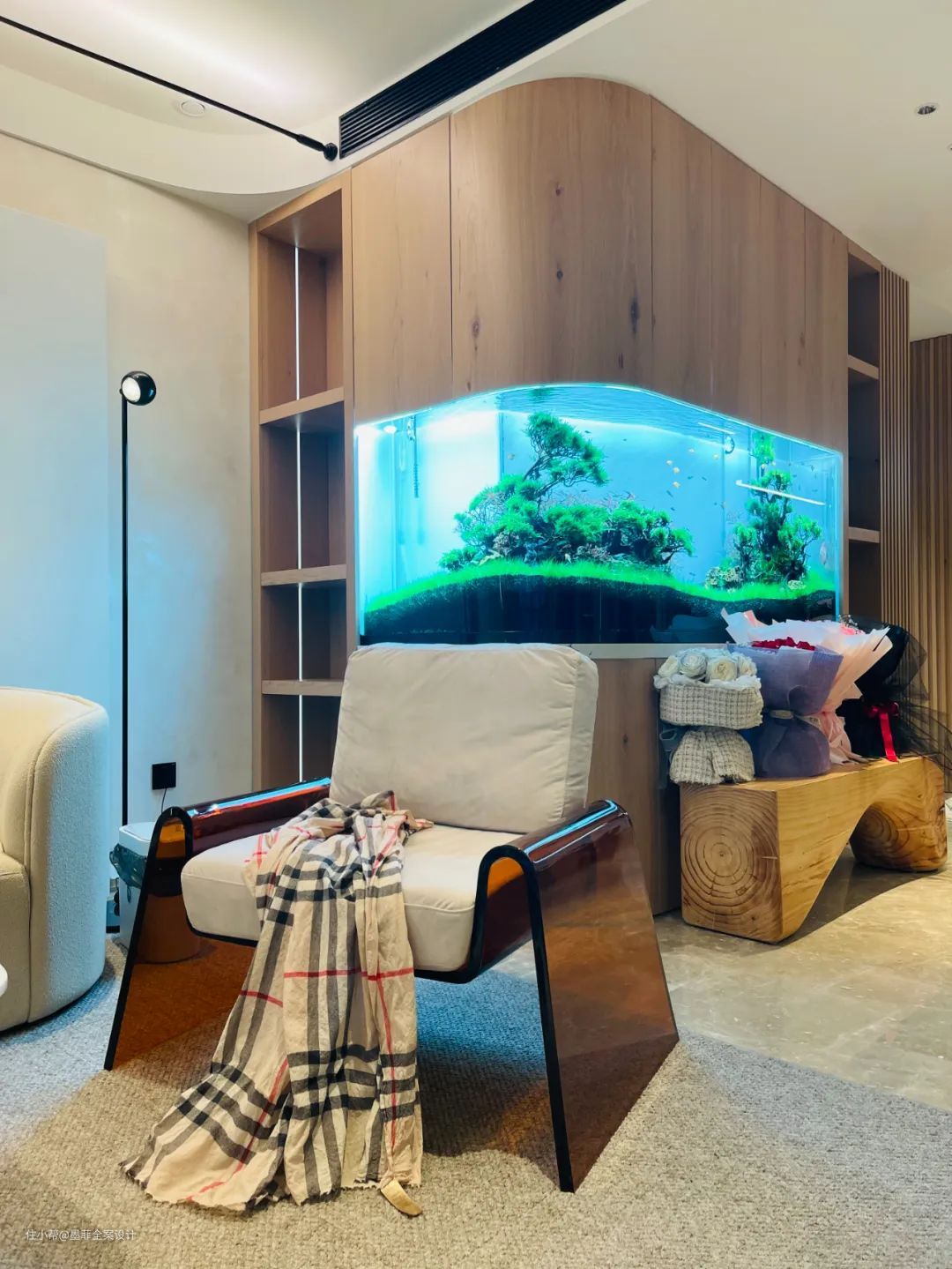 经过与小姐姐的深入沟通,发现小姐姐是一个不甘平庸的人,担心纯色搭配太过无聊,于是设计师大胆借用鱼缸的灵动嵌入木柜之中,进门就是满眼勃勃的生机,得到了小姐姐非常高的赞赏!