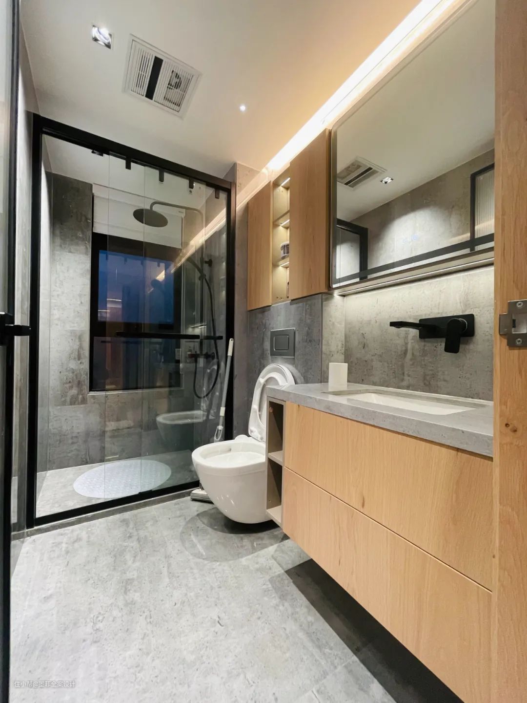 主卫亮面的水磨石瓷砖本身就带有光泽度,当灯光打上去更有反射效果,让整个卫生间更加通透,沐浴区的置物收纳做了一个内嵌壁龛,可以节省不少空间,原木色定制浴室台,洗面盆功能与收纳柜功能并存,归纳自然.