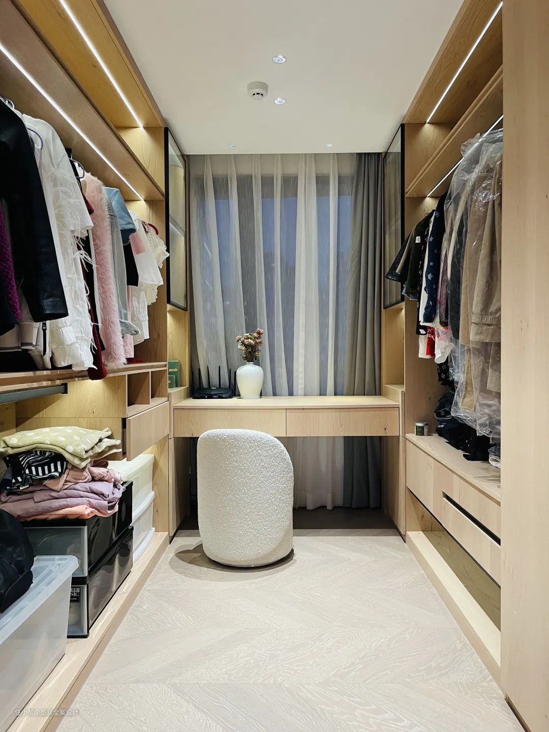 作为女孩子最爱的衣帽间怎么能草草带过,茶色的衣柜格调摩登而明快,带柜门+开放式组合,功能分区明确,减少翻找带来的不便之感,兼具防尘与存取方便的作用,首饰柜下方内置岛台,让手表、首饰等小物件都精准划分,拥有翻倍的储物量,小姐姐就尽情买买买吧!