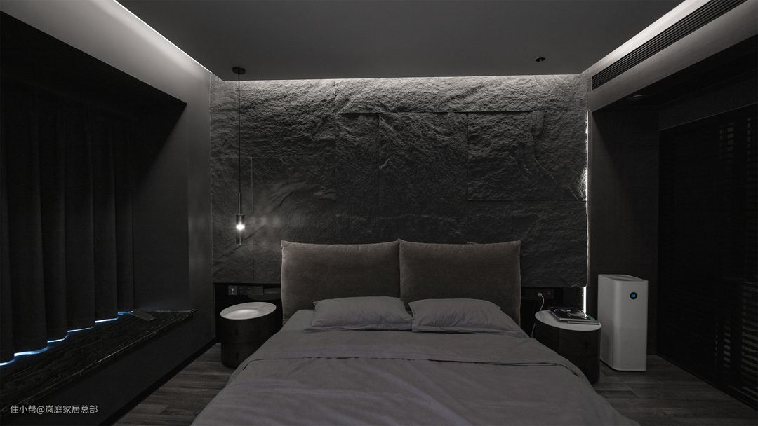 床头背景墙延续了沙发背景墙的蘑菇石,用天然石材做背景墙,可以说是非常大胆又独一无二,虽然是暗黑风但一一点也不压抑。