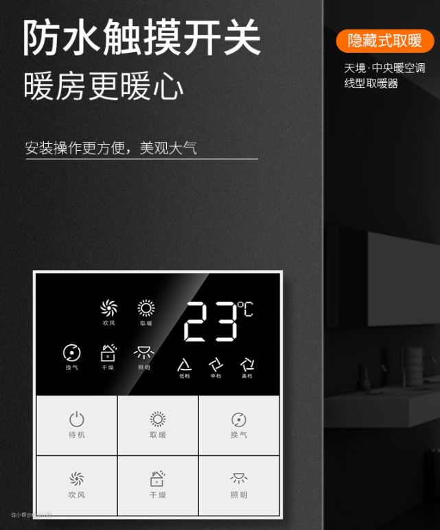 目前风暖浴霸的控制方式主要有3种:机械按键、触控、遥控,而App控制一般都是辅助遥控。其中,遥控应该是安装控制最简单方便、实用性更好的一种控制方式,防水溅的遥控器轻松实现随心控。像传统的机械式开关,防水等级较低,不够安全,操作体验一般。触屏和无线遥控,安全系数和防水等级高,多数是用于中高端风暖浴霸,价格往往偏高。