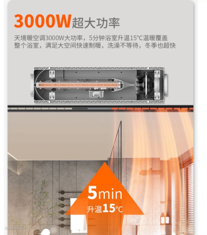 这款浴霸在加热方式上,采用2730W大功率的极速加热,利用直流暖风科技进行强劲的输送。能够做到三秒速热,整体出风速度比较快,出风的效果也比较好,对应采用了新一代变频恒温科技比较优越。可以支持手机APP智控,无论是取暖,换气还是其它操作都能够进行。