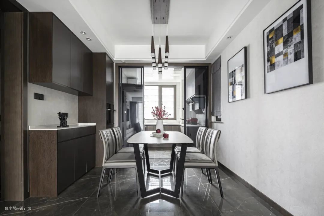 ▲餐厅采用了黑白灰色调的设计,给人一种简约而高雅的感觉,让人感到舒适自在。餐边柜中间镂空,方便日常的使用及收纳,时刻保持着干净整洁,让人感到舒适和放心。