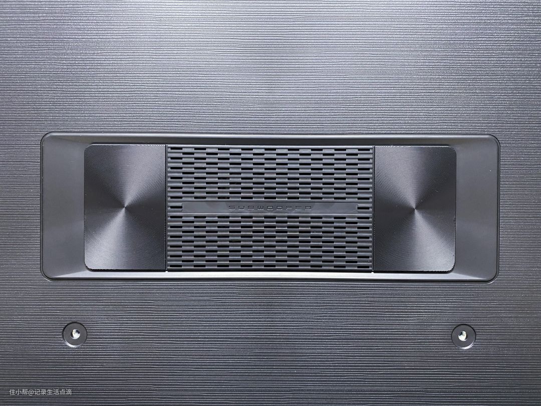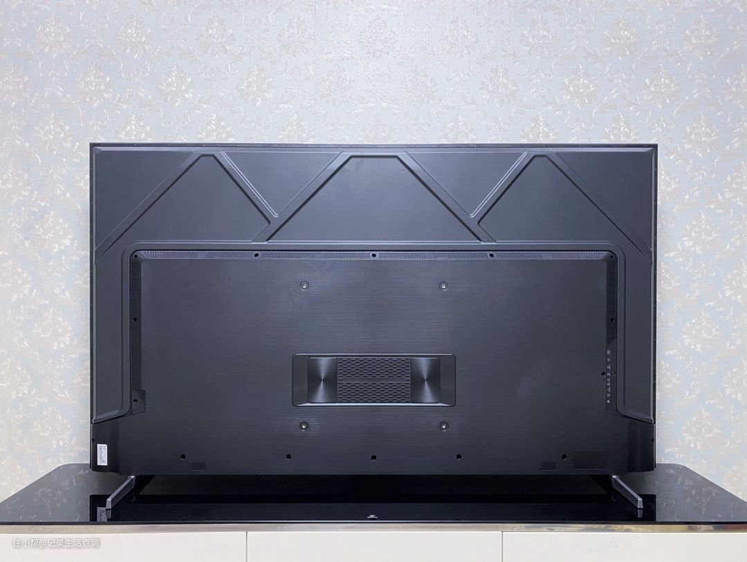 再来看看电视背面,中间最醒目的就是1.3L独立音腔的低音炮,首次开机时会让你选择电视是坐放还是壁挂,系统会根据不同的安装方式匹配最佳的音质效果。