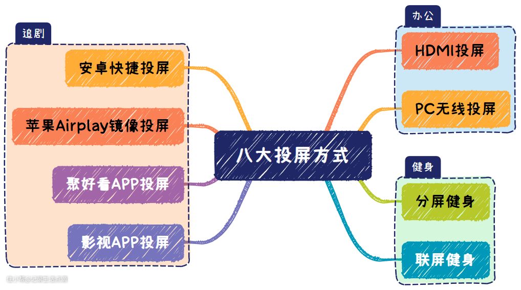 海信电视E5K拥有的高清全能投屏功能,可实现追剧、办公、健身三大场景的8种投屏方式,上面已经用思维导图给大家梳理出来了,可以满足大家的各种投屏需求,无论是手机、平板,还是笔记本、电脑,都可以方便地投屏到电视上,毕竟在大屏幕上体验会更好。