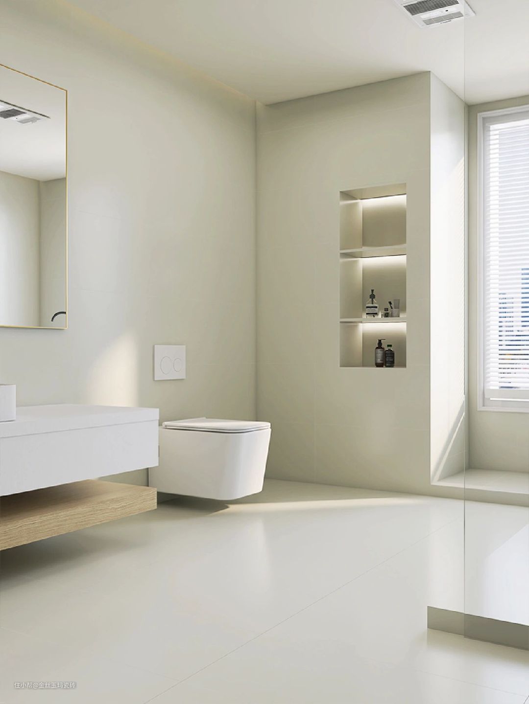 其次在规格上建议选择750*1500MM,900*1800MM甚至更大规格的瓷砖,有条件的话也可以用岩板,大规格通铺全屋,同色美缝搭配上,整体空间更具有通透感性