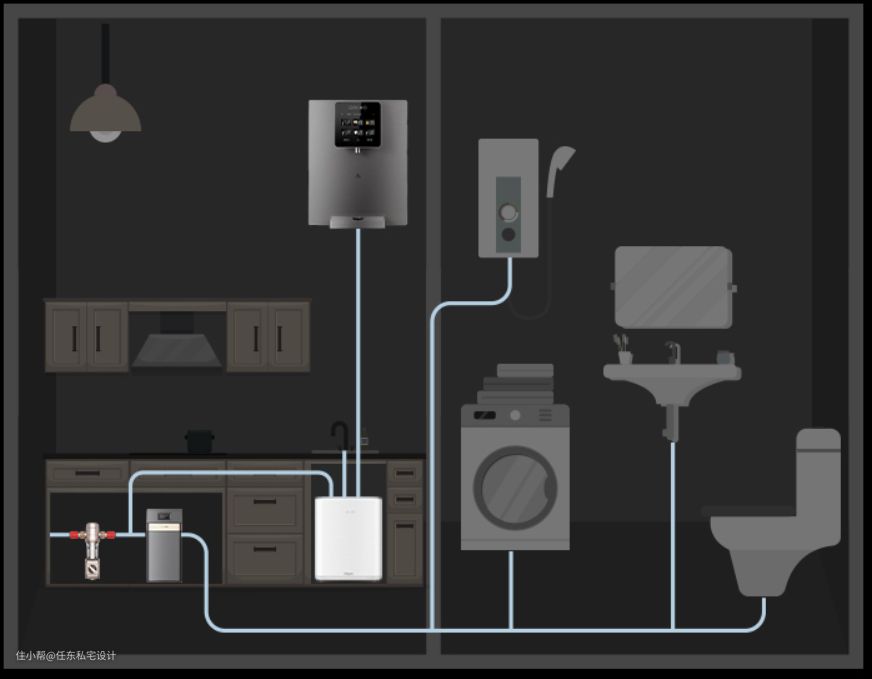 除了全屋净水,其实还有全屋用水、全屋水暖场景。可以根据不同区域水质情况、不同户型布局和家庭用水习惯,定制包含净水、软水、饮水、热水等在内的成套解决方案。