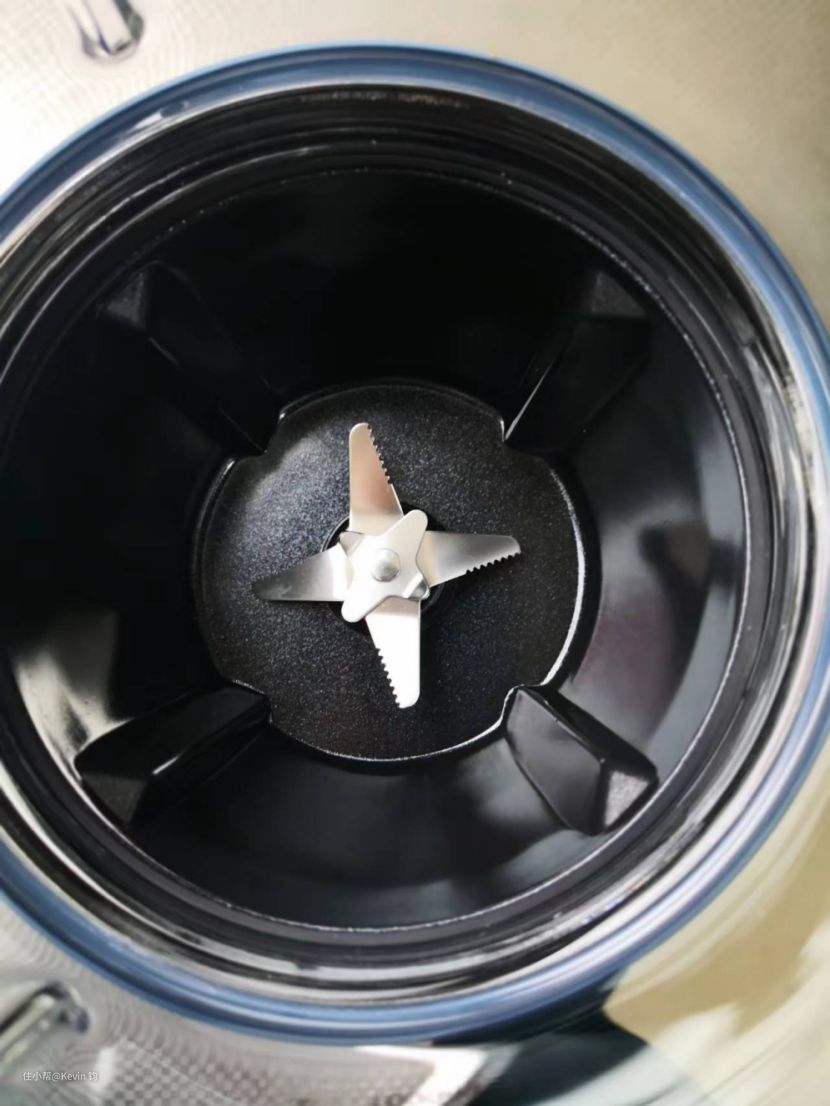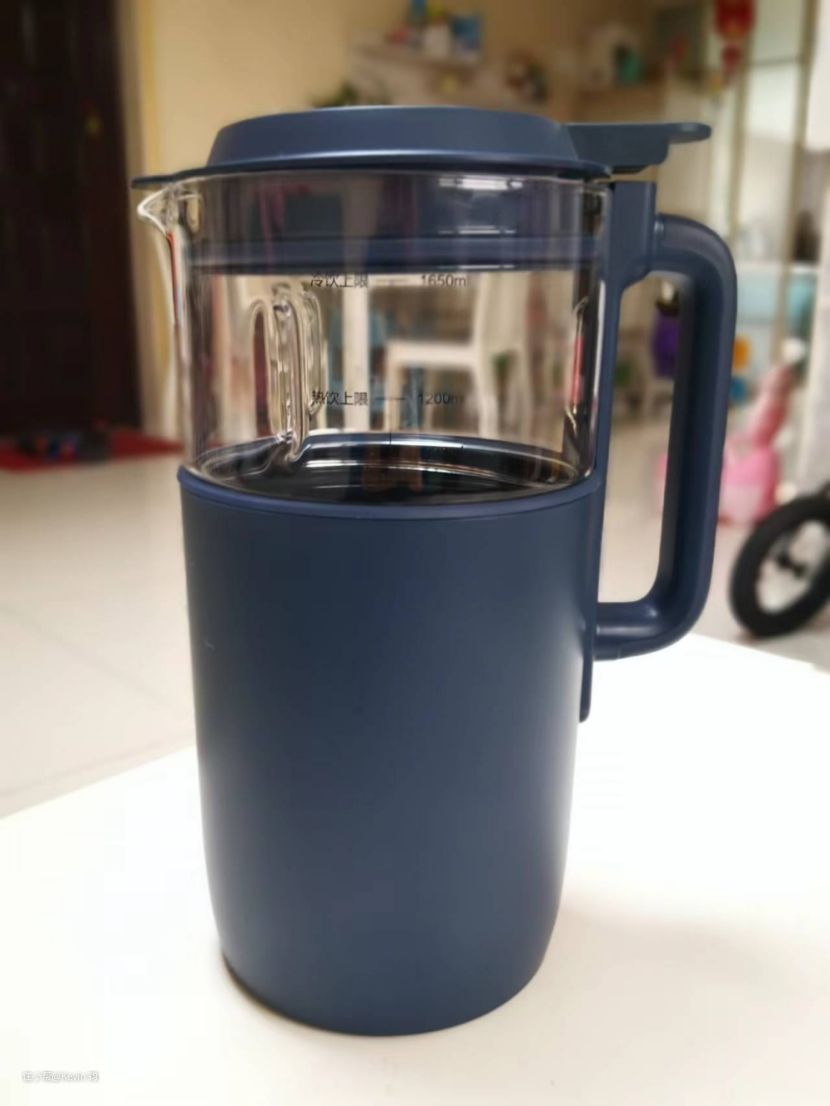 这款破壁机采用杯体电机一体化设计。杯体的上半部分采用的是食用级高硼硅玻璃,厚度3mm左右,透明杯身可以清楚的看到食材的情况,而且高硬度材质更耐用;下半部分采用的是PC材质包裹,可以防止烫伤,还可以帮助阻隔一部分噪音。