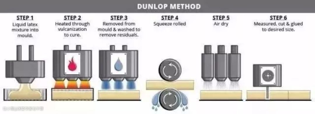 邓禄普工艺是将发泡后的乳胶液注满整个模具,加热硫化成型后,打开模具取下乳胶床垫,再进行清洗、烘干、质检、切割程序,最后成品包装入库。